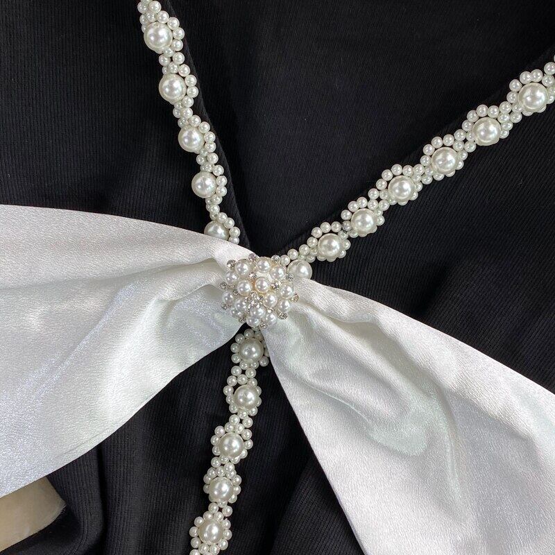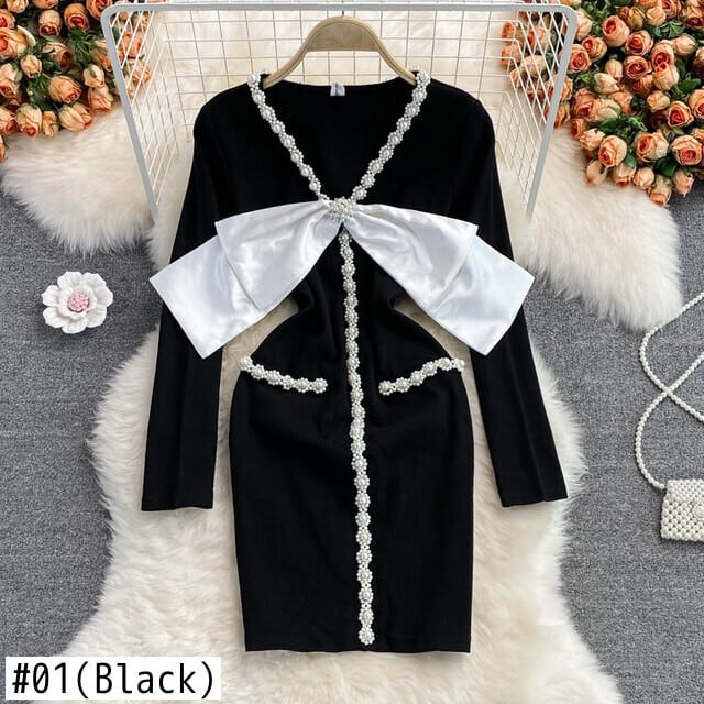 女性ニットシースドレスパールビーズビッグボウノットボディコンニットドレス弾性Vネックボタンセーターショートドレス リボン エラスティック 伸縮 真珠 Rhc80224856847
