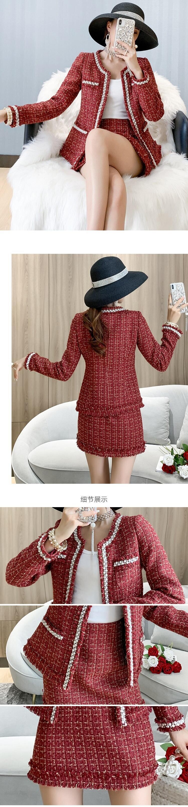 ラグジュアリー秋冬女性2点セット2020滑走路パールビーズテルシックレッドツイードジャケットコート+ペンシルスカートセット オータム 秋物 ウィンター 冬物 真珠 Rhc78613877146