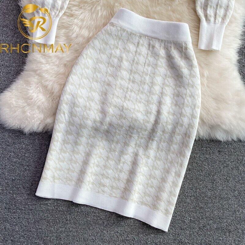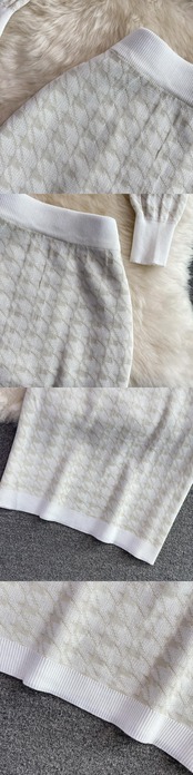 チェック柄パールボタン千鳥格子ニットセーター+ウエストミニスカートセットツーピーストラックスーツ秋Vネックオフィススーツ オータム 秋物 真珠 会社 学校 通勤や通学にも Rhc37041172398