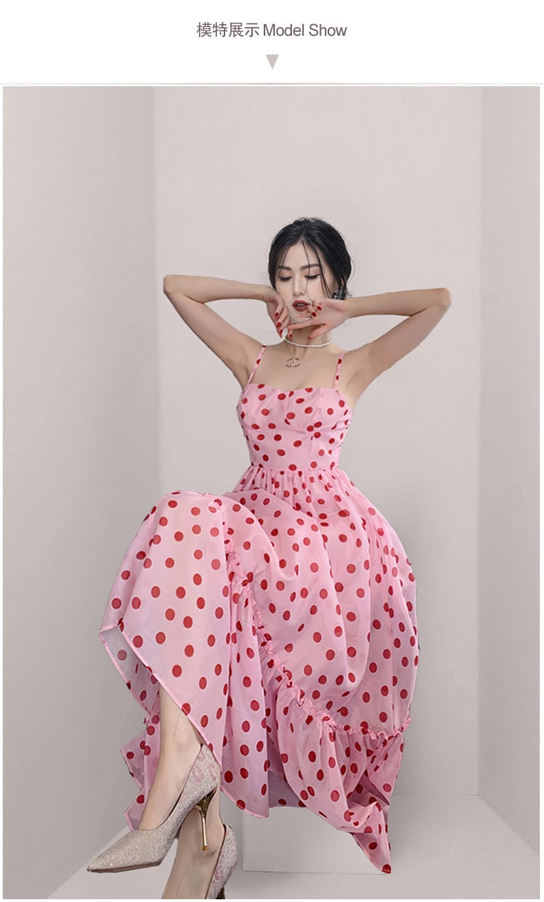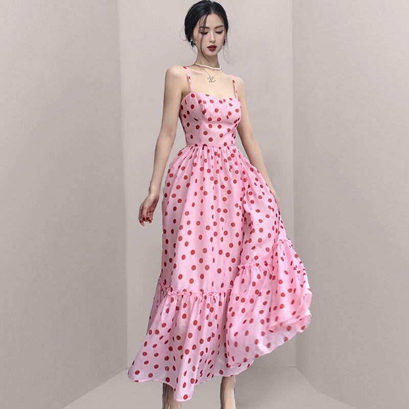 セクシーなピンクの水玉模様の夏のマキシドレス女性の甘いかわいいスパゲッティストラップロングキャミソールドレスVestidosシック 大人ガーリー スウィート キュート カジュアル サマー 夏物 Rhc39783968478