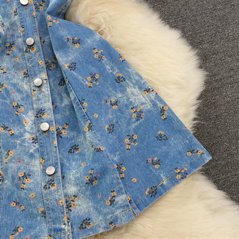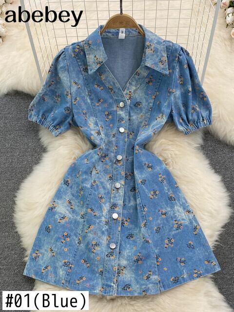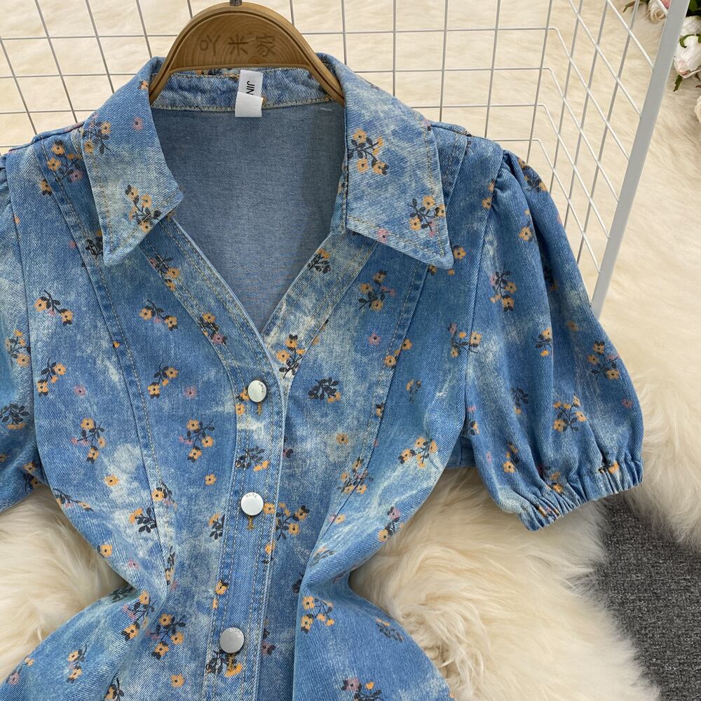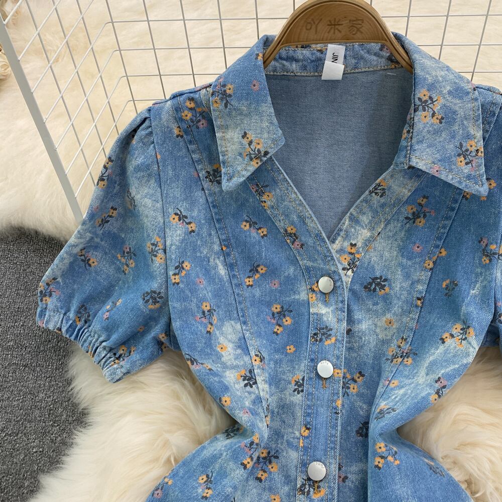 2022年夏の女性のポロネックブルーデニムシングルブレストドレススウィートフローラルプリント半袖ミニタイド ショート ハーフスリーブ 大人ガーリー キュート カジュアル サマー 夏物 花柄 Abe18458334366