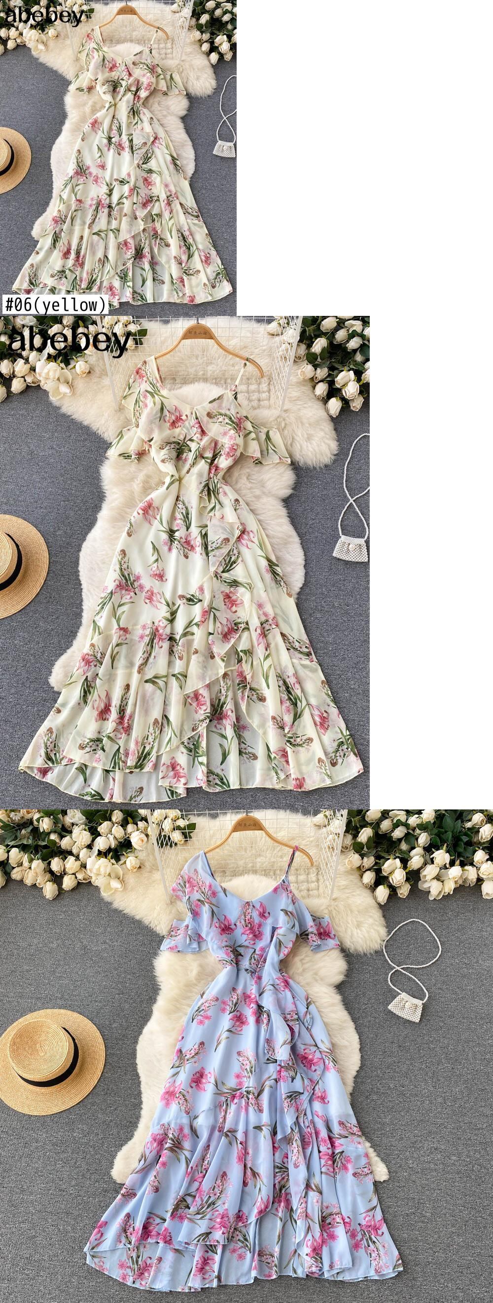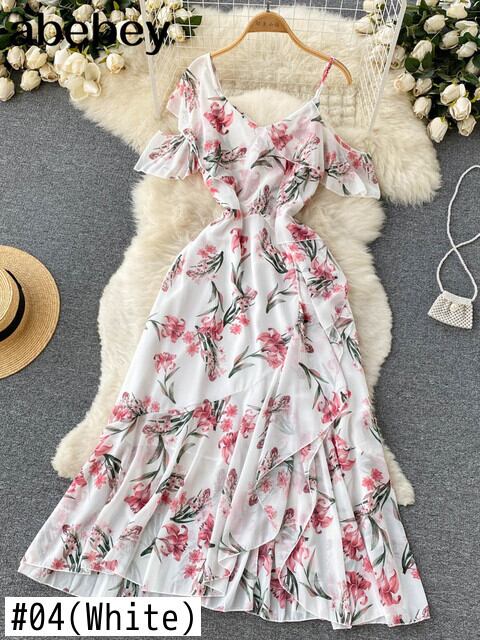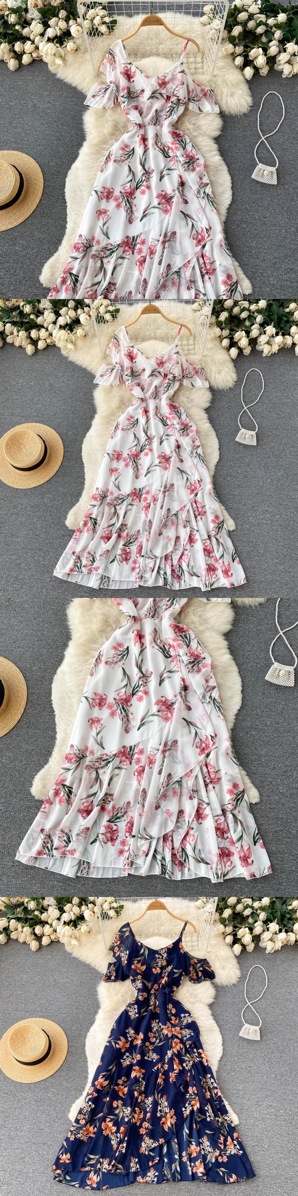 オフショルダーシフォンフローラルドレス女性2022年夏シングルサイドサスペンダー不規則なロングスカートローブ サマー 夏物 花柄 Abe6073234056
