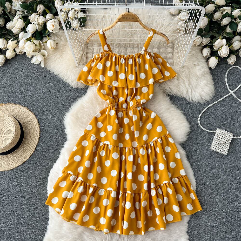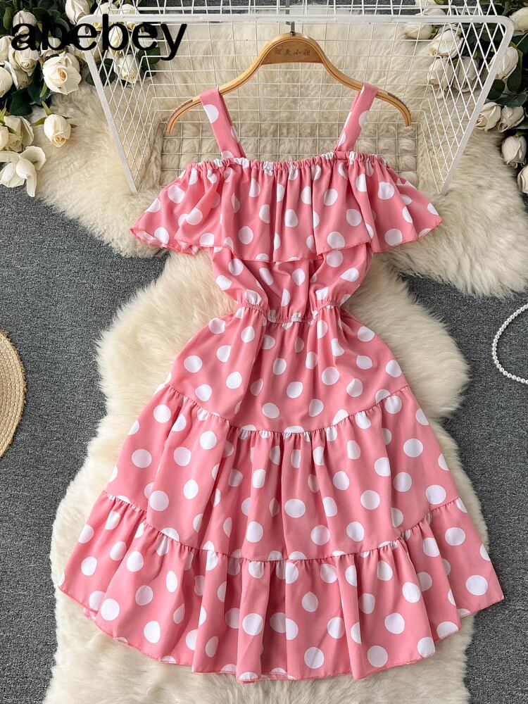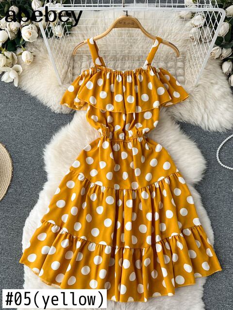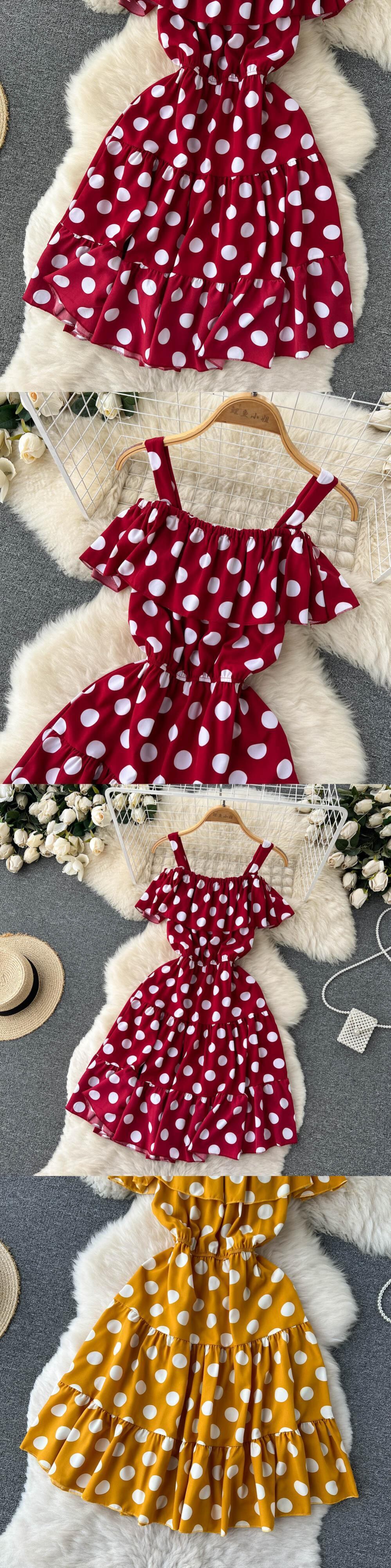 サマードットストラップレスプリーツ女性シフォンドレスウエストスパゲッティストラップミニドレスVestidos発送 夏物 Abe12948642918