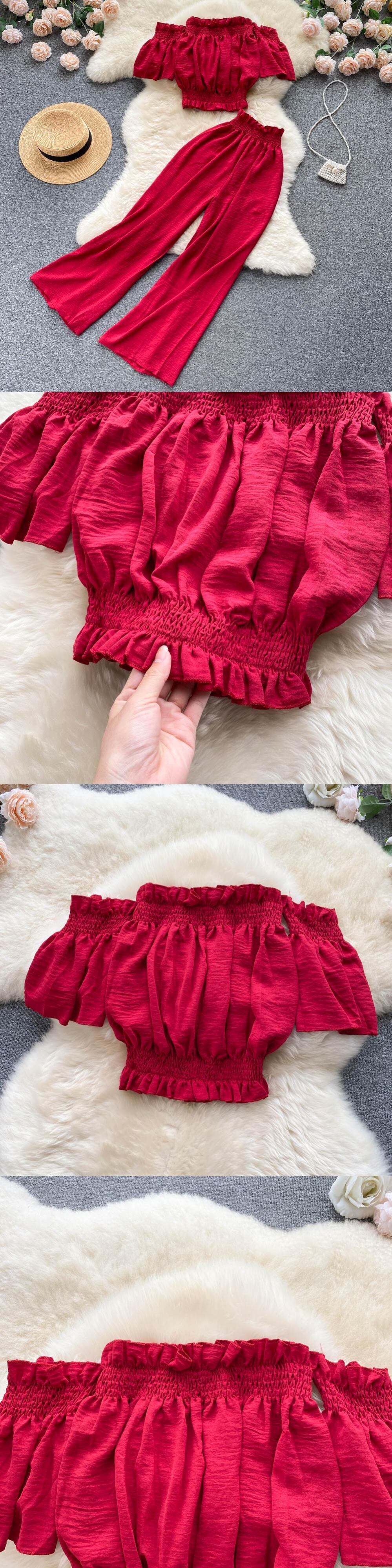 2022年サマーグリーン/ブラック/レッドツーピースセットレディースセクシースラッシュネックショートトップス+ウエストワイドレッグパンツスーツ 夏物 ワイドパンツ Abe34546617778