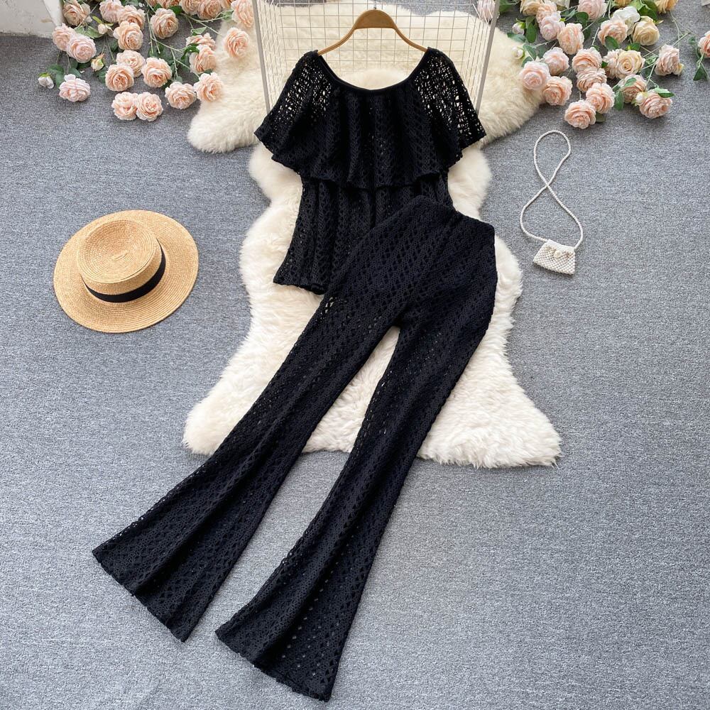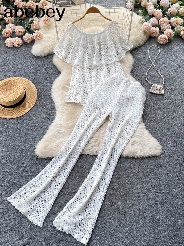 白/黒人女性夏ボヘミアンスーツセクシーなオフショルダーレースシャーリングショートトップス+ワイドレッグロングパンツツーピースセット衣装 ホワイト ブラック サマー 夏物 ワイドパンツ Abe40350076662