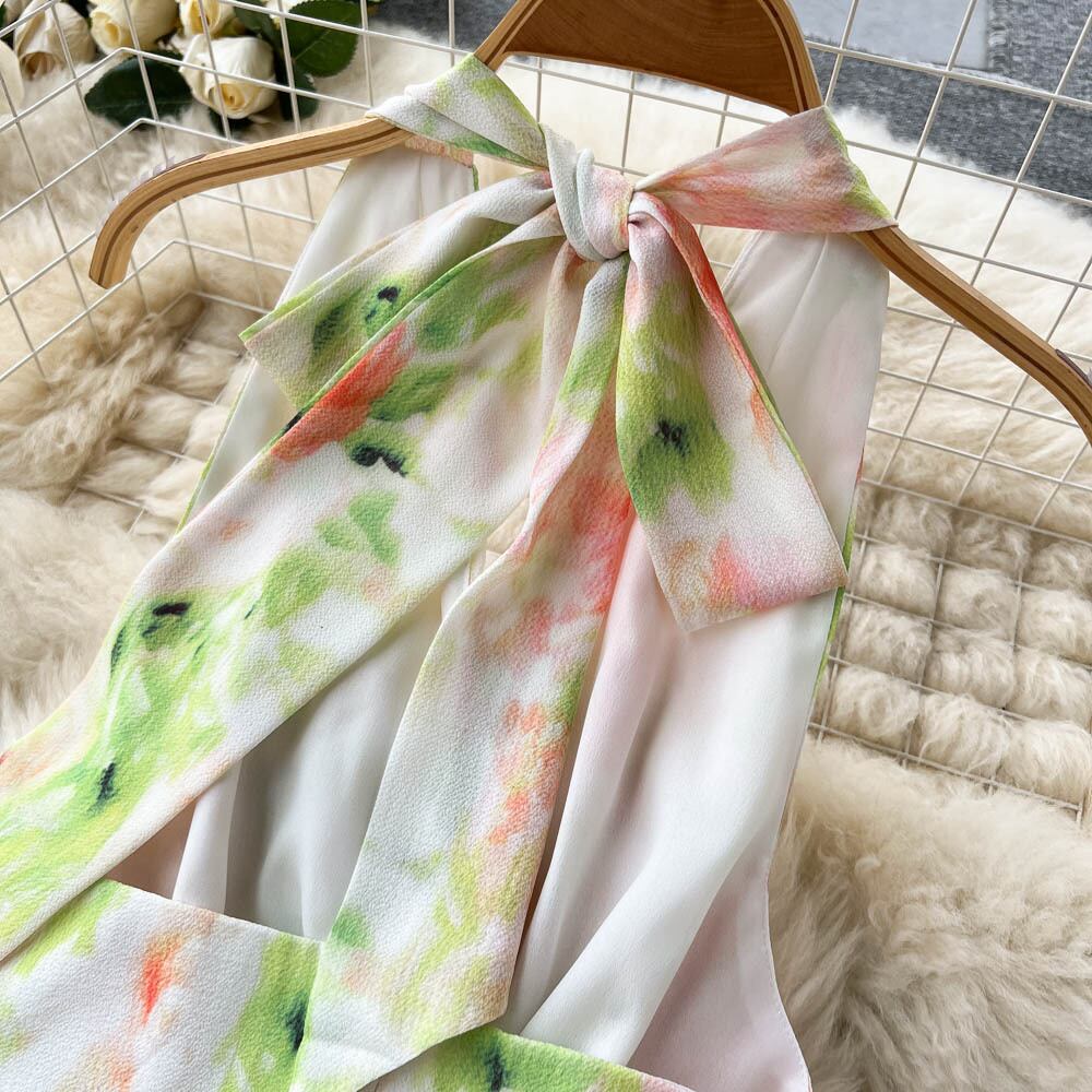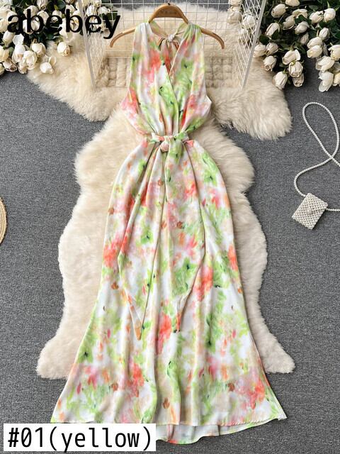 レディースドレスホルターノースリーブクロップドマキシロングドレスサマーシフォンソリッドフローラルウエストスリムフィットパーティードレス 夏物 花柄 ソリッドカラー Abe87191070144