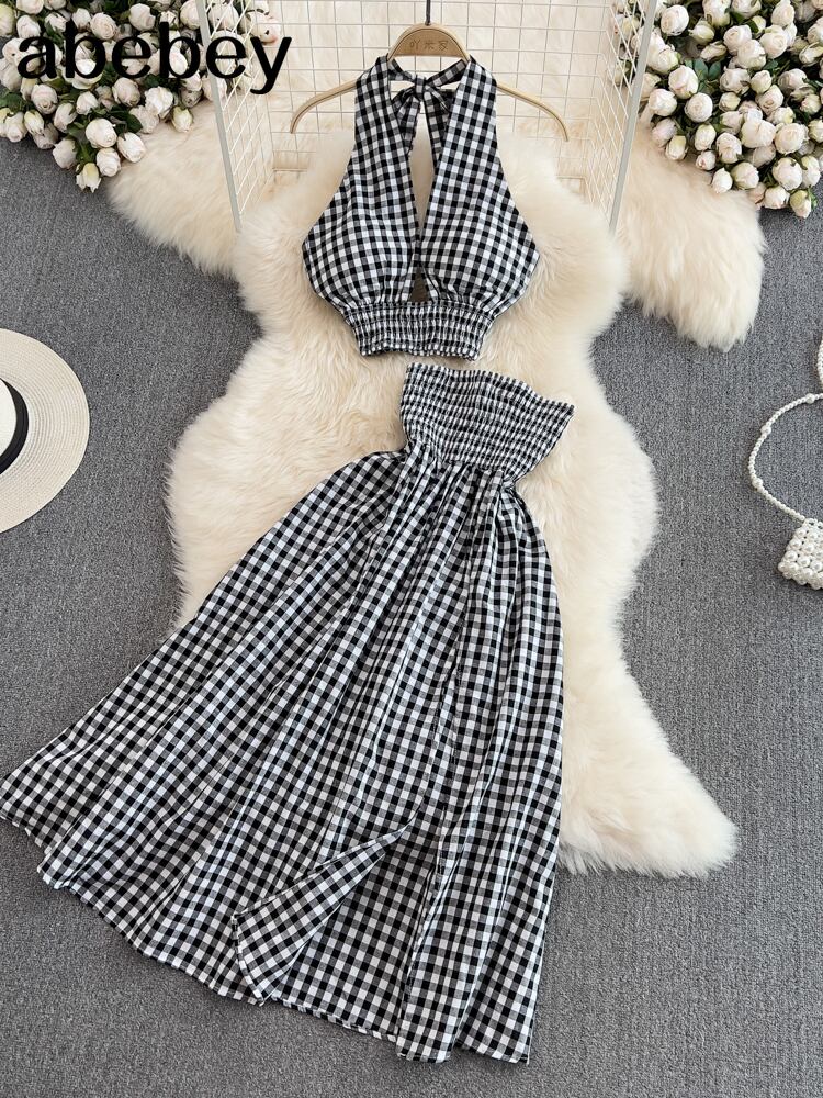 女性チェック柄サマースーツ女性ホルター中空アウトセクシーキャミソール+伸縮性ウエストロングスカートツーピースセット エラスティック 夏物 Abe88931711084