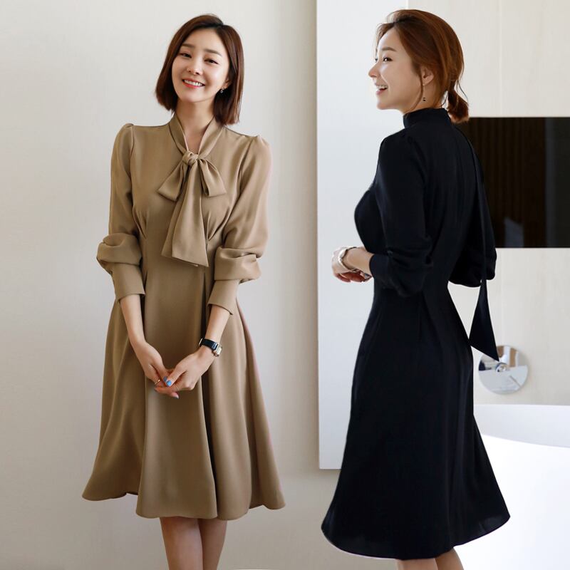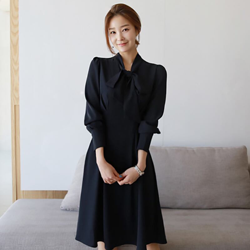 秋の女性の気質ミディアムレングスドレス蝶ネクタイネックオフィスレディシャツドレス長袖スリムプリーツドレス ロング リボン オータム 秋物 会社 学校 通勤や通学にも Rhc90055168664