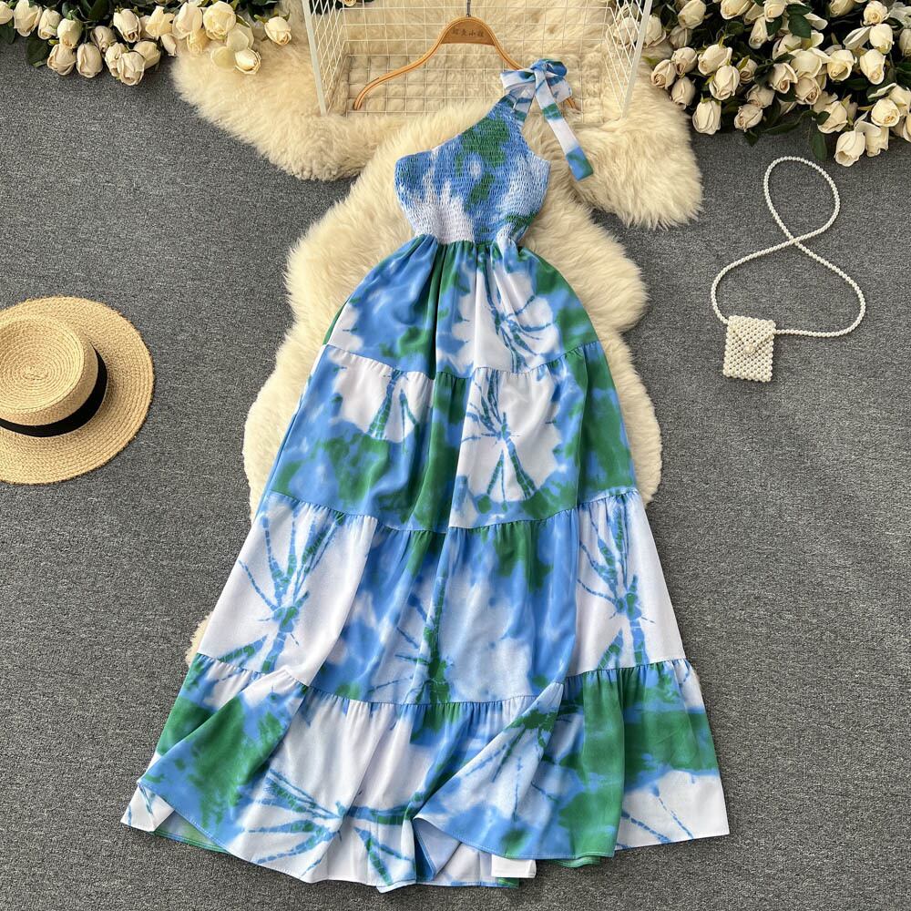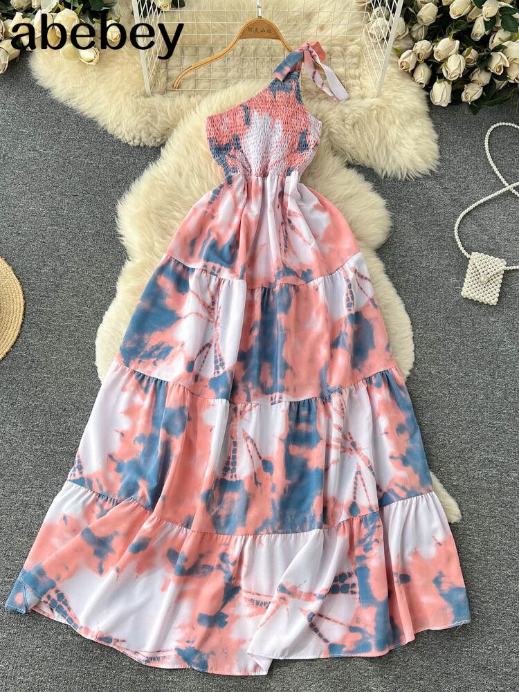 夏のセクシーなタイダイプリントスパゲッティストラップロングドレスビーチバケーションジッパーオープンバックAライン サマー 夏物 Abe27288687045