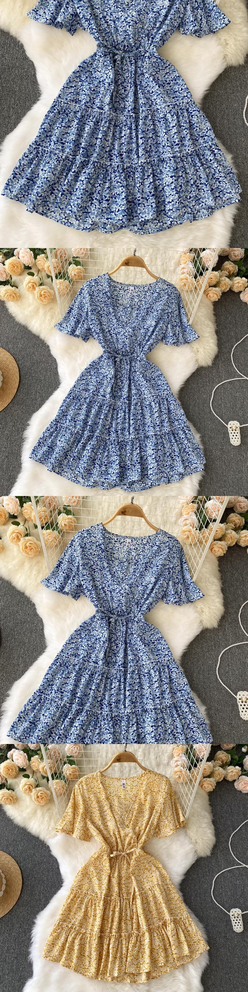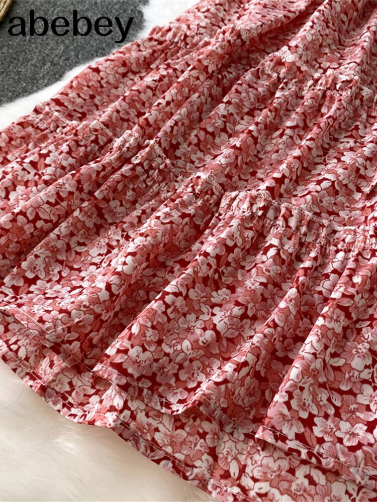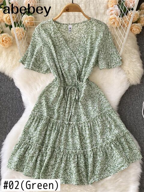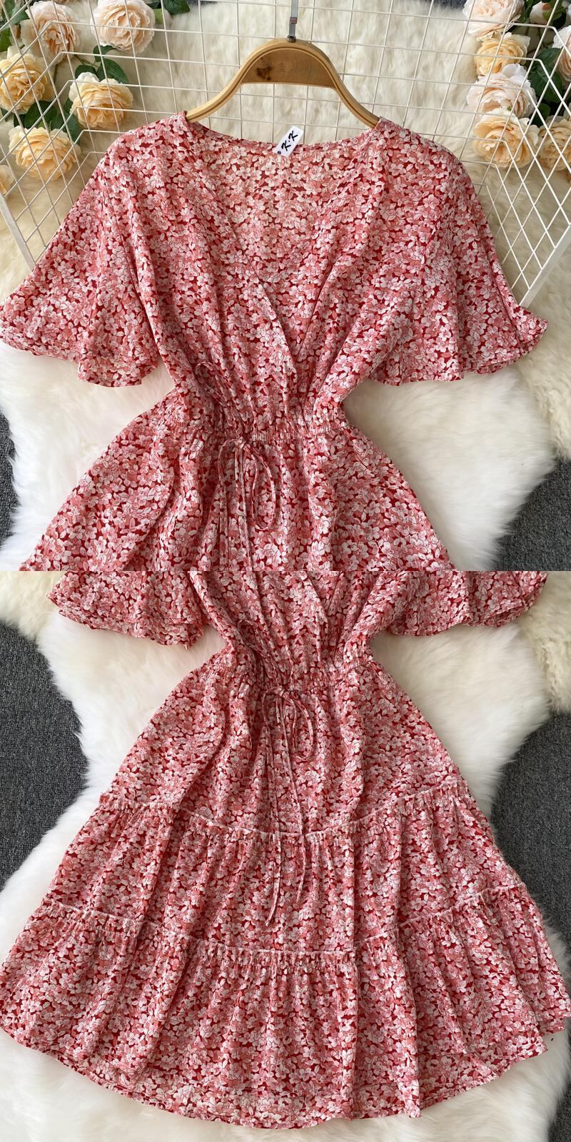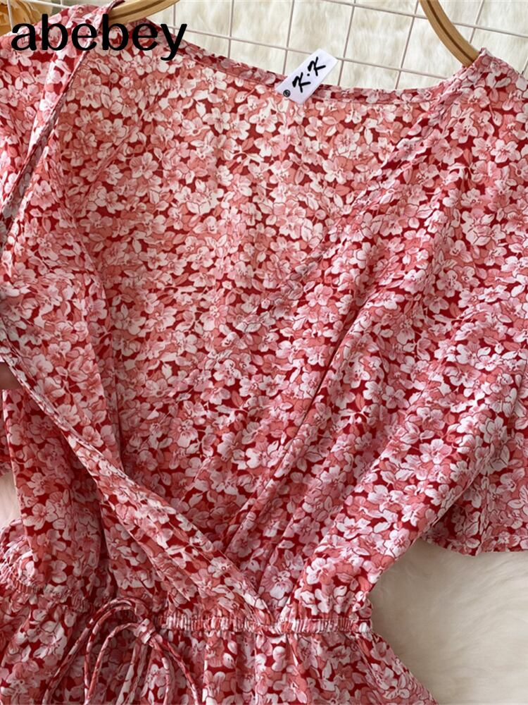 女性のドレス2022年夏セクシーなVネックフローラルプリント自由奔放に生きるビーチドレスフリル半袖Aラインミニドレスラップサンドレスローブ ショート ハーフスリーブ サマー 夏物 花柄 Abe7334715826