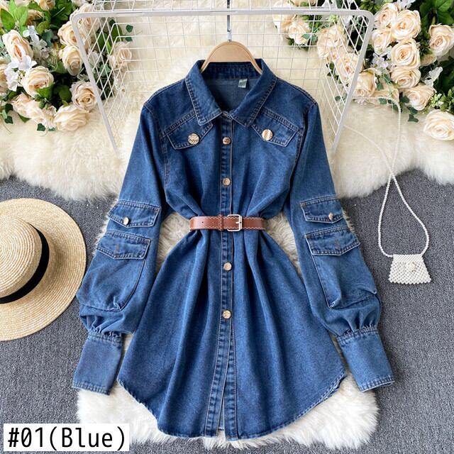 女性のためのレトロなデニムドレス長袖ターンダウン-襟シングルブレストドレス2021秋のストリートウェアドレスベルト ロング オータム 秋物 ハーネス Rhc80388748411