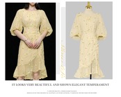 女性ミディドレス2022夏半袖花刺繡ガーゼイエローフィッシュテールドレスオフィスレディフォールドマーメイドドレス ハーフスリーブ 刺繍 サマー 夏物 花柄 会社 学校 通勤や通学にも Rhc66267476454