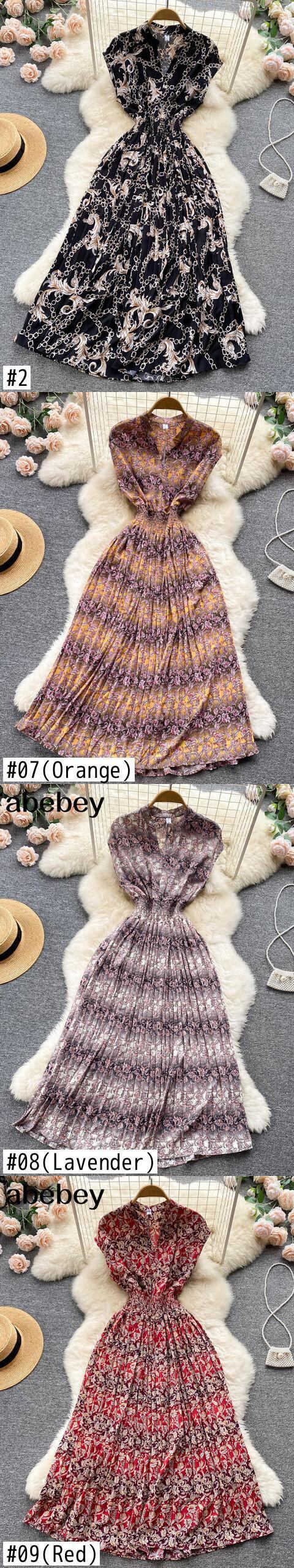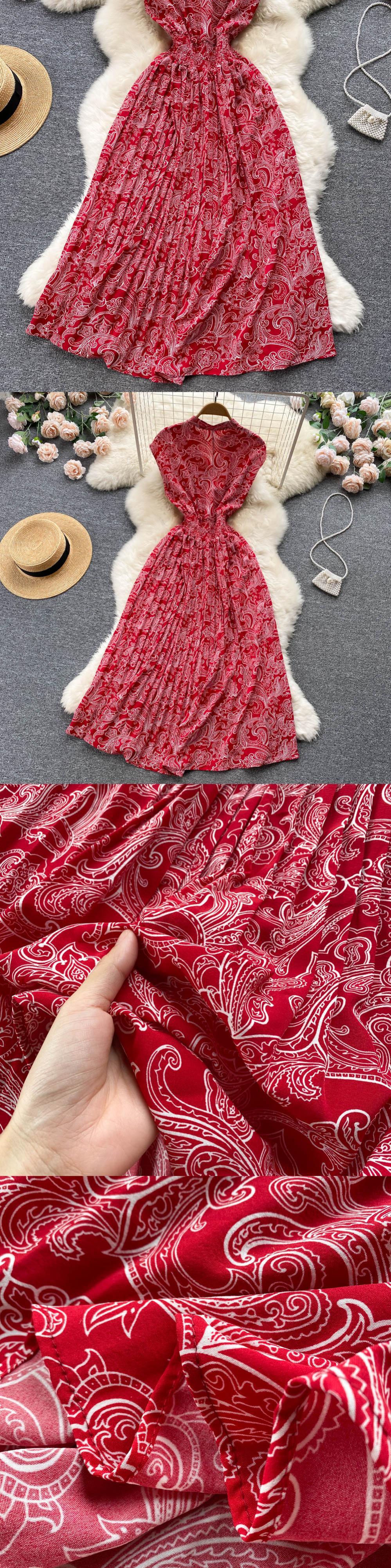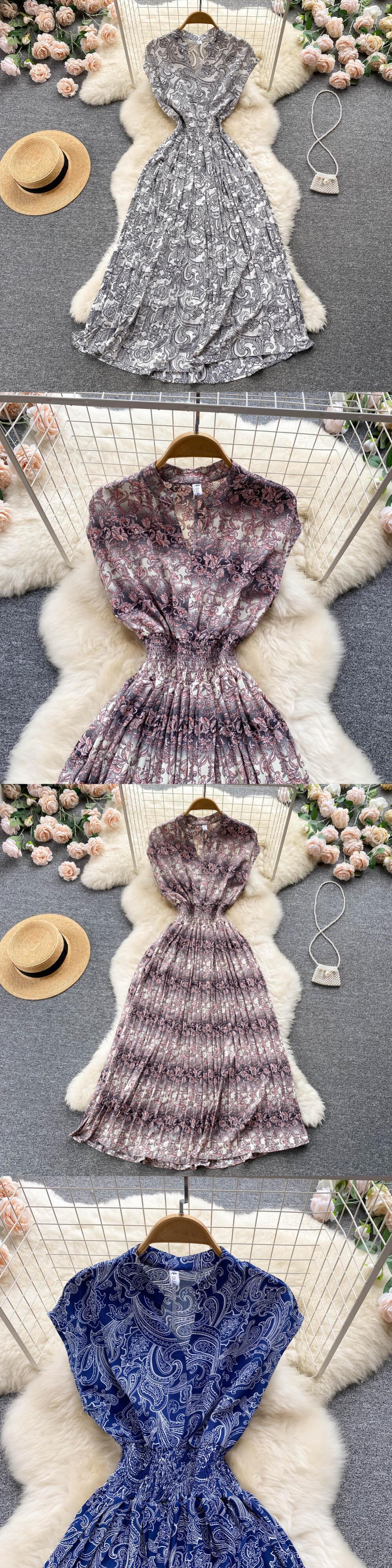 夏のボヘミアン女性プリントプリーツマキシロングドレスセクシーなVネックノースリーブウエストバケーションビーチVestidos サマー 夏物 Abe56351519953
