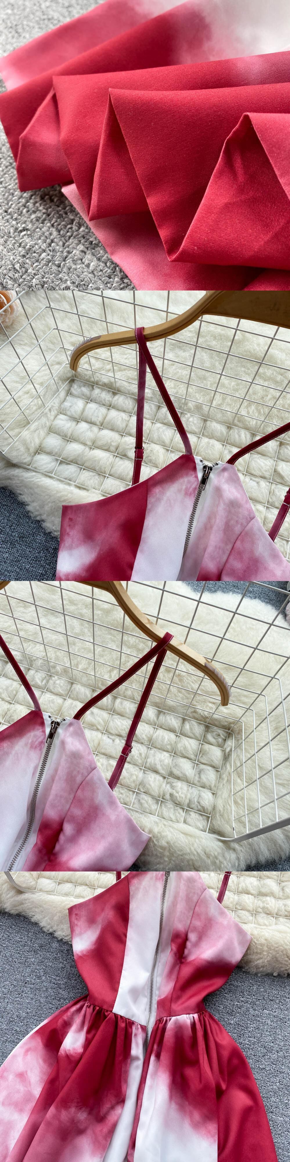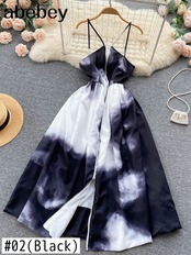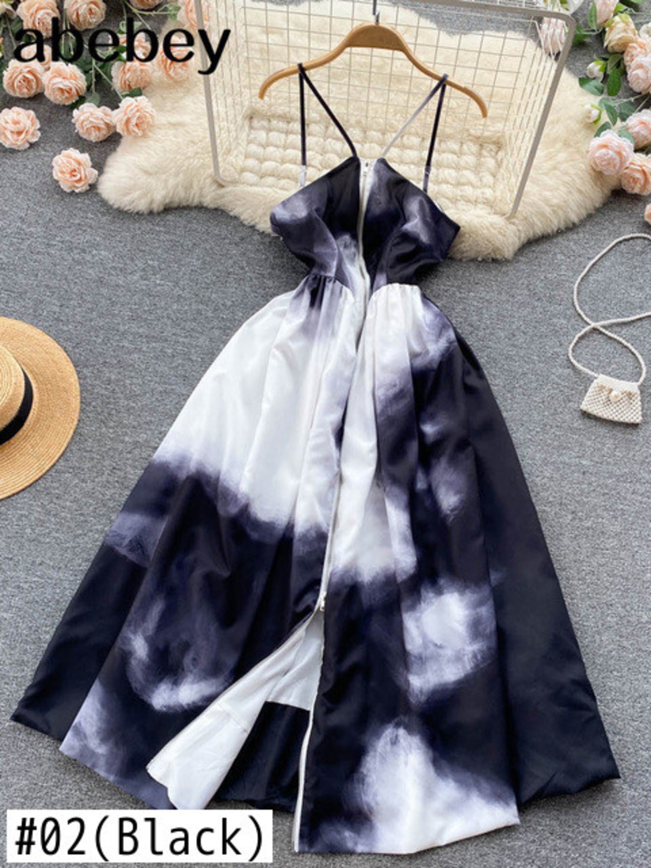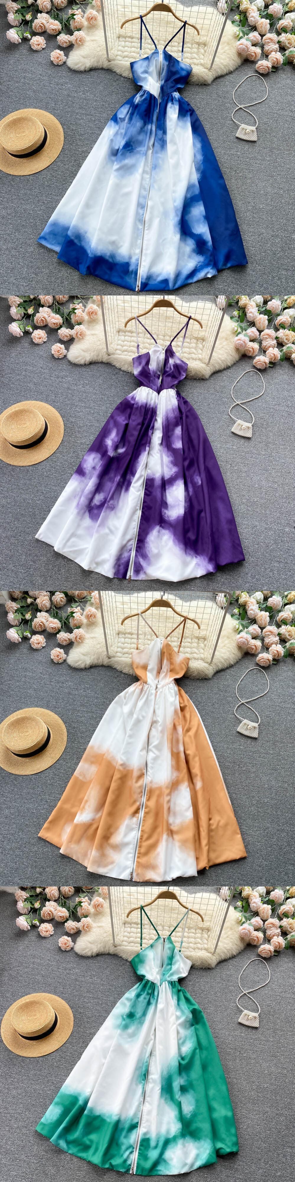夏のセクシーな絞り染めプリントスパゲッティストラップロングドレスビーチバケーションジッパーオープンバックAライン サマー 夏物 Abe88292600895