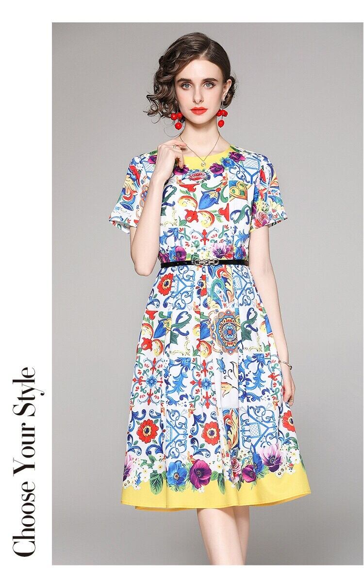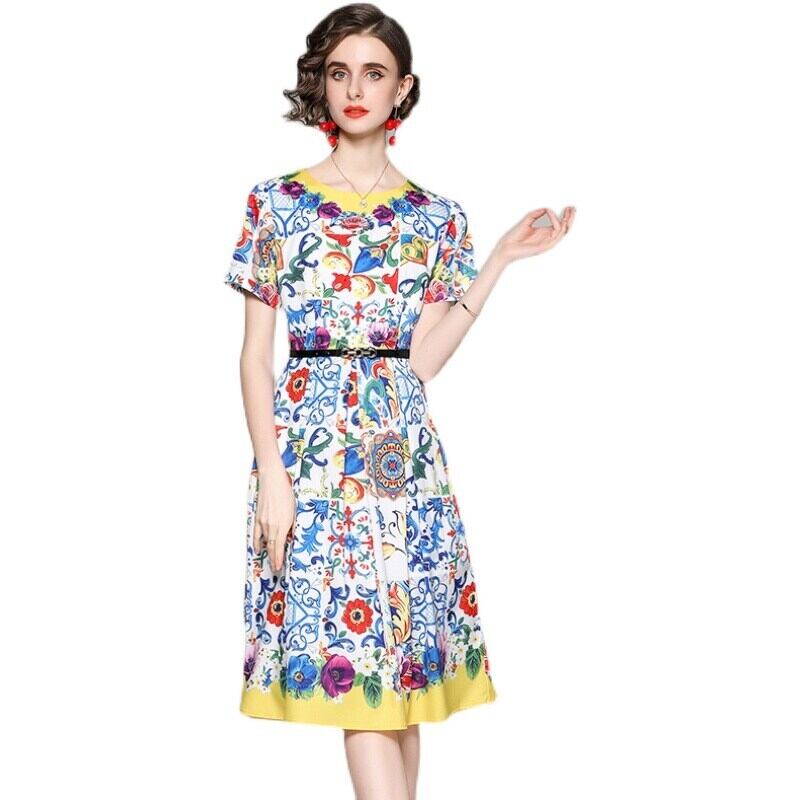 2021est滑走路サマードレスレディース半袖ラウンドネック青と白の磁器フローラルプリントパーティーミディドレス ショート ホワイト ブルー ハーフスリーブ 夏物 花柄 Oネック Rhc70336467648