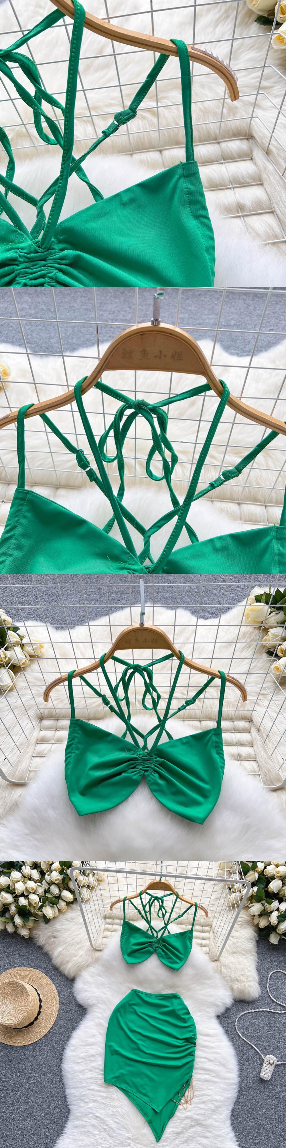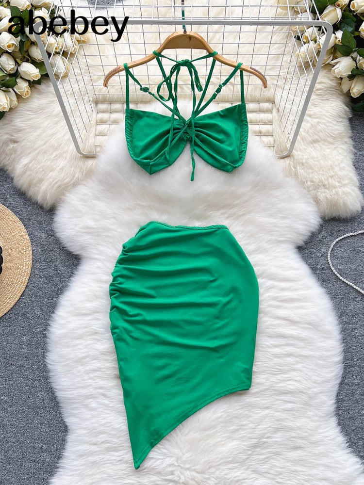 緑の女性のセクシーな作物のタンクトップ不規則なミニスカートパーティークラブツーピースセットの衣装2022夏の服 サマー 夏物 グリーン Abe49423447296