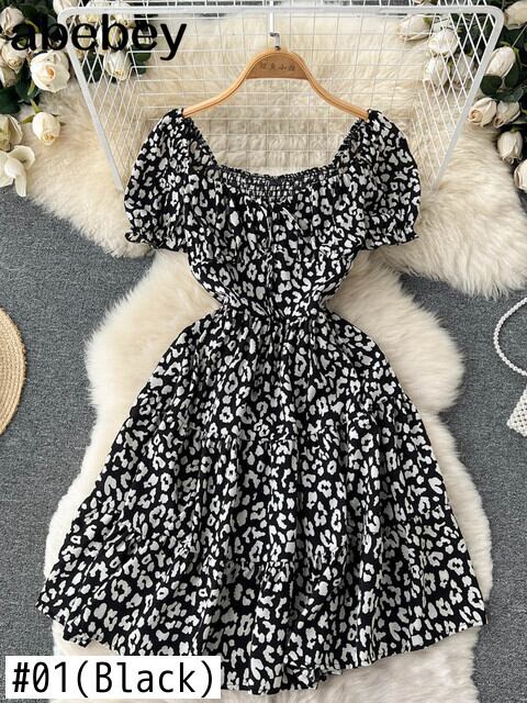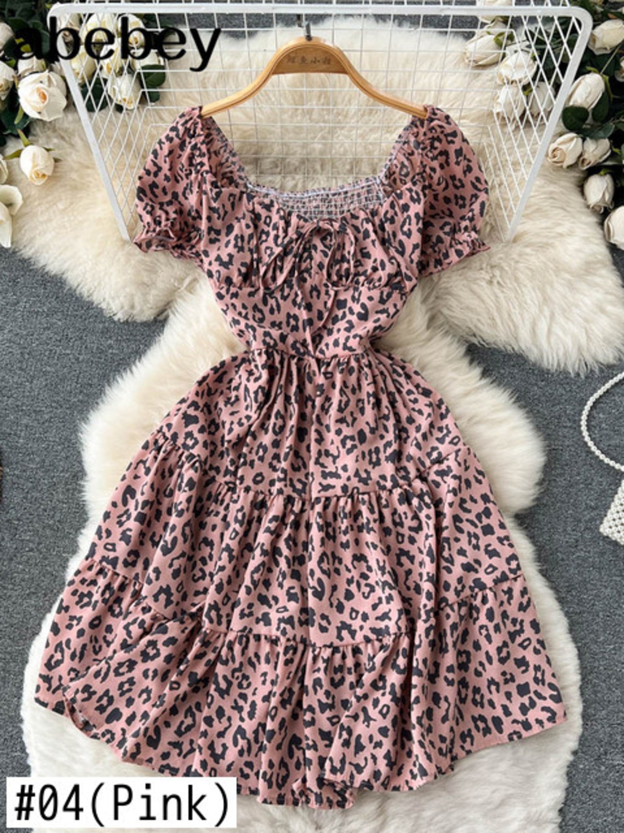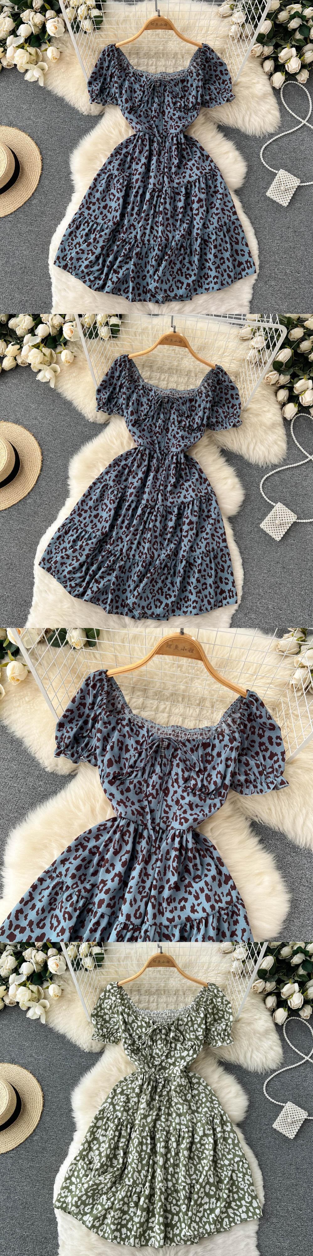 女性ヒョウドレスパフスリーブスクエアカラーシャーリングフリルドレス夏自由奔放に生きる休暇プリントショートサンドレス ラッフル サマー 夏物 スクウェア Abe54117436023