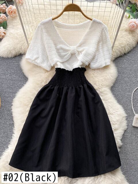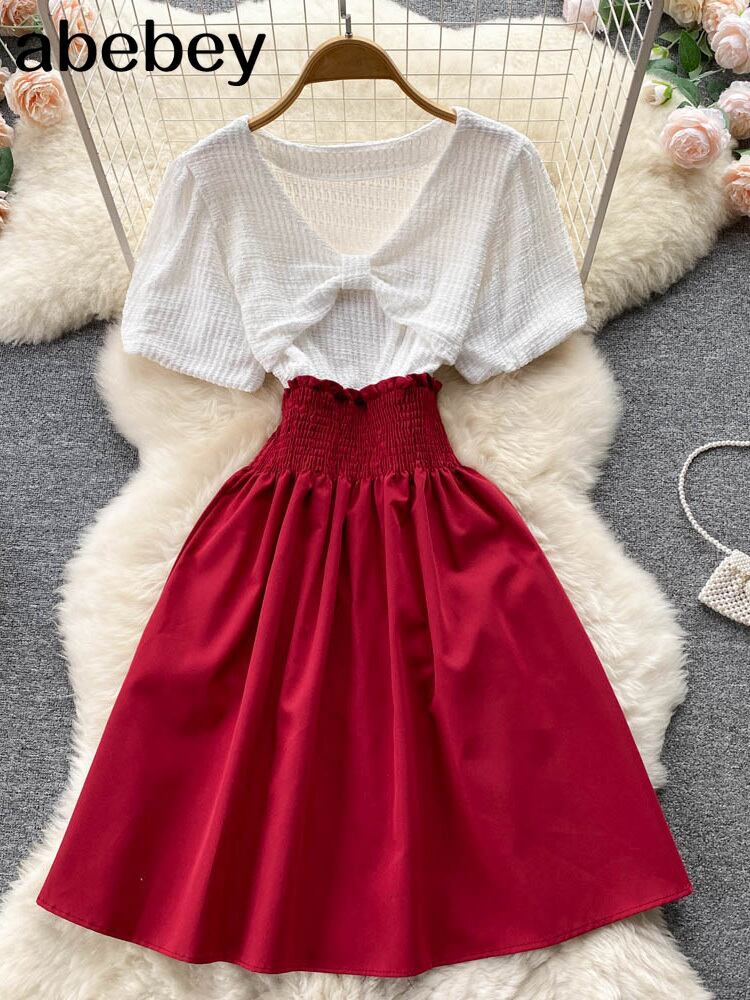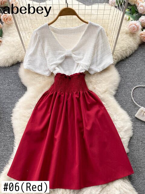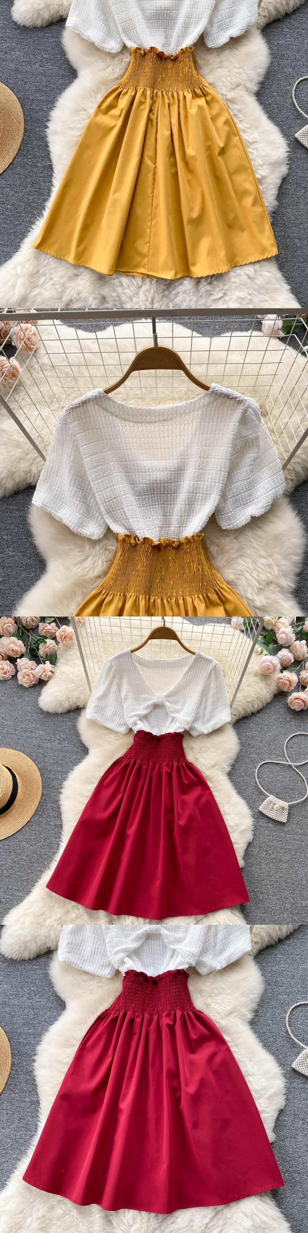 緑/ピンク/赤フレンチプリーツドレス女性半袖VネックソリッドAラインドレス2022夏休みビーチサンドレス ショート レッド ハーフスリーブ サマー 夏物 ソリッドカラー グリーン Abe52455489315