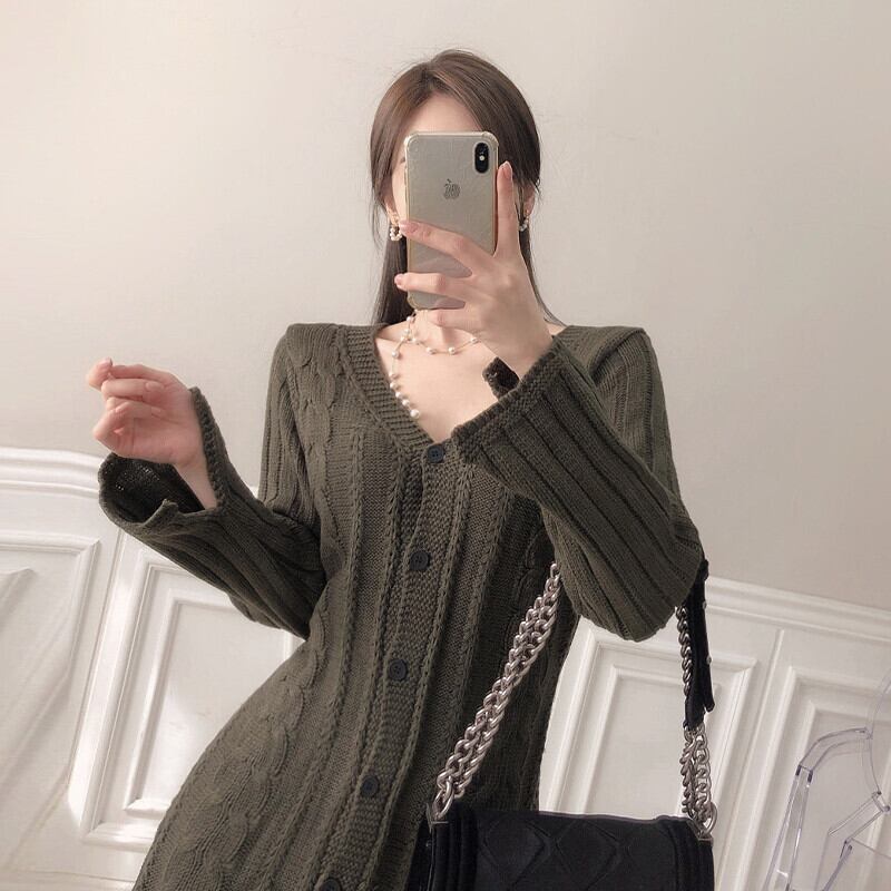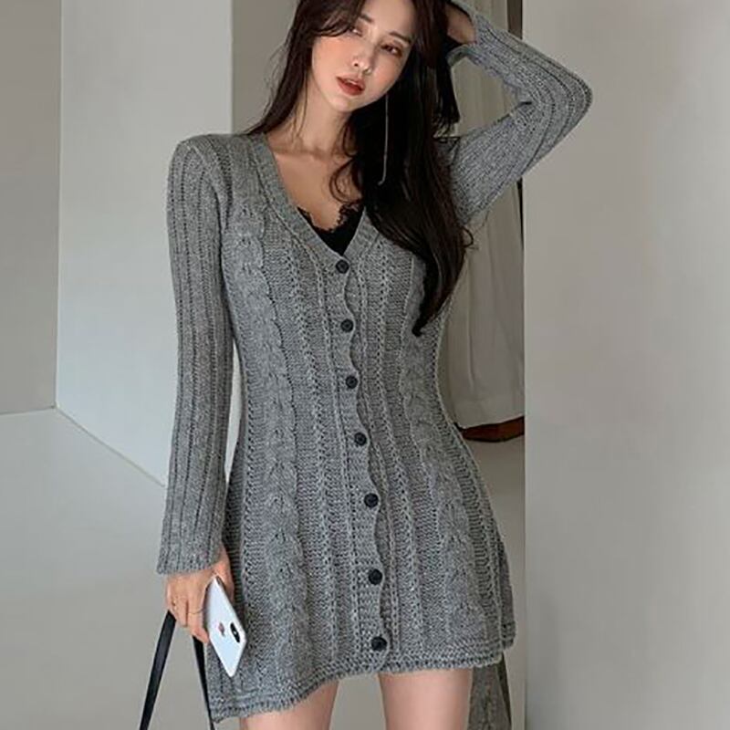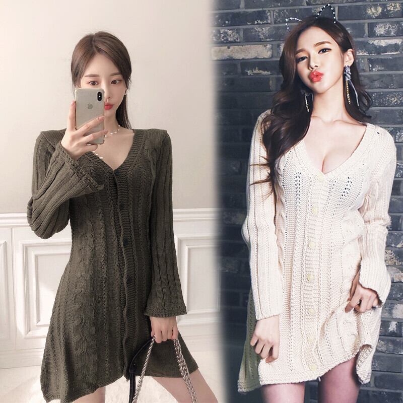2020年春秋Vネックジャージードレスニットセーターレディーススリムロングパゴダスリーブミニスカート スプリング 春物 オータム 秋物 Rhc42048460552