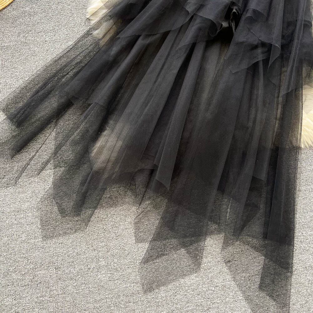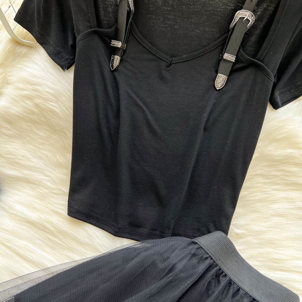 女性ニットTシャツ+メッシュスカートスーツボウノットソリッドトップスソリッドイレギュラースカートセット女性ツーピースセット リボン ソリッドカラー Abe51480231422