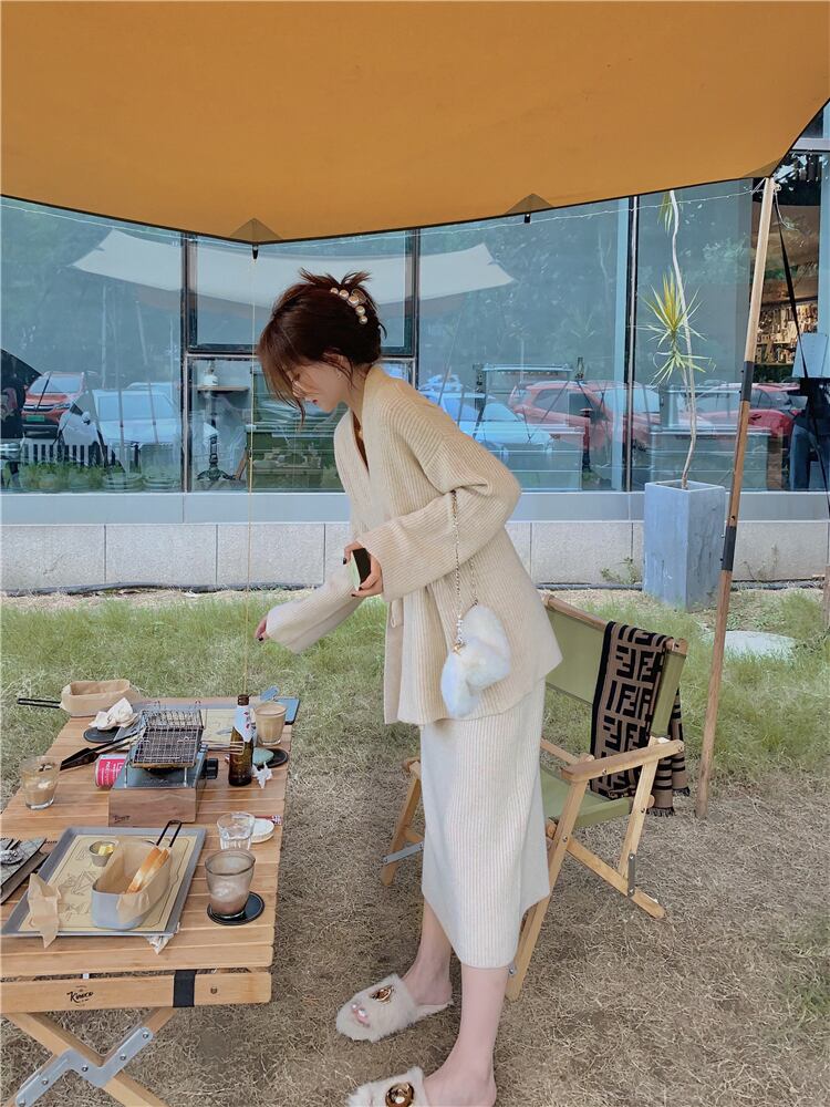 秋のツーピースセットレディースフレンチジェントルVネック長袖セーターコート+ウエストスリムニットワンピースセット ロング オータム 秋物 Rhc77346585917