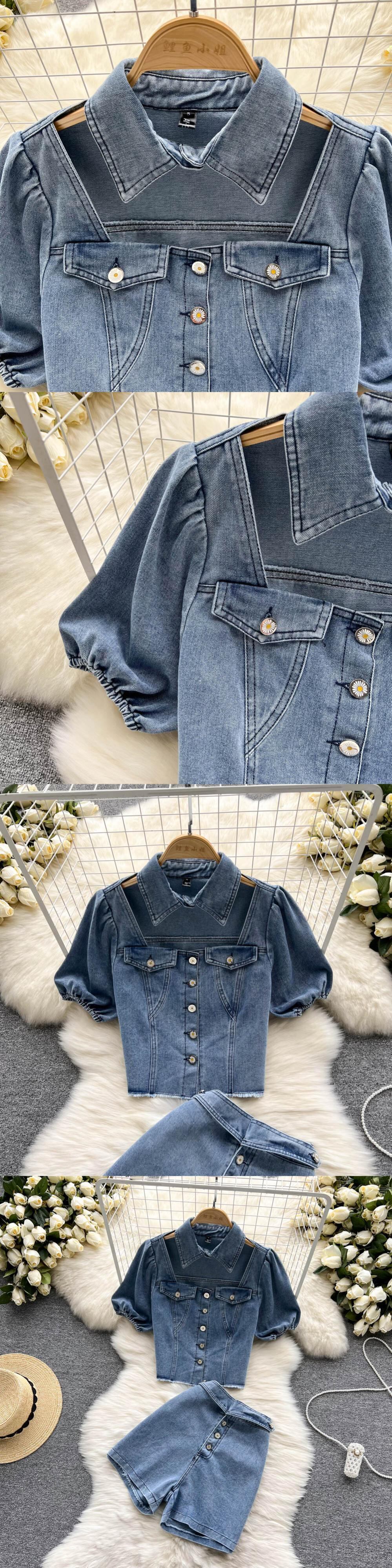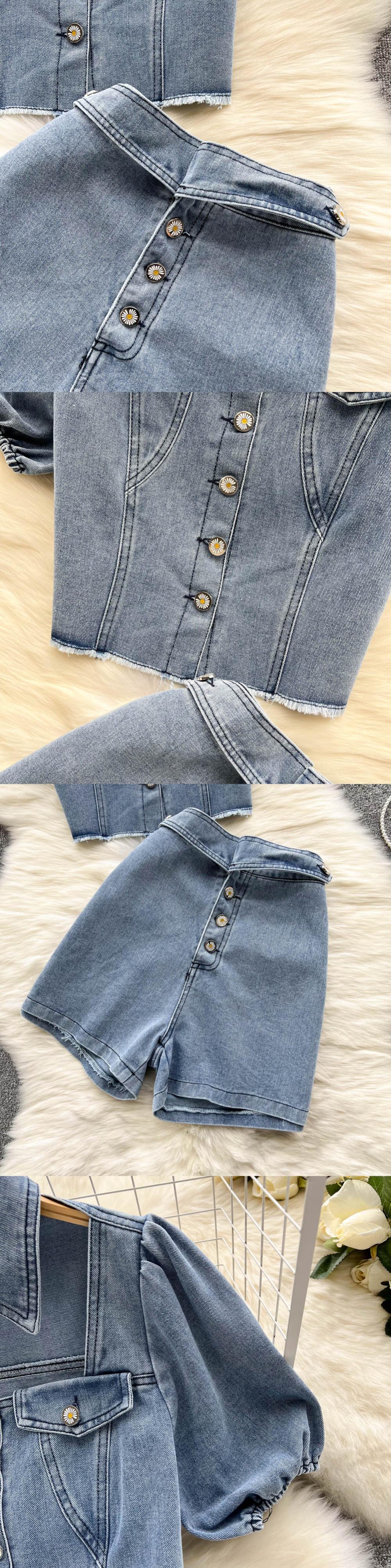 レディースジーンズツーピースセットドレスレースアップサッシ半袖シャツクロップトップボタンショーツデニムスーツ ショート ハーフスリーブ ブルマー Abe99541405578