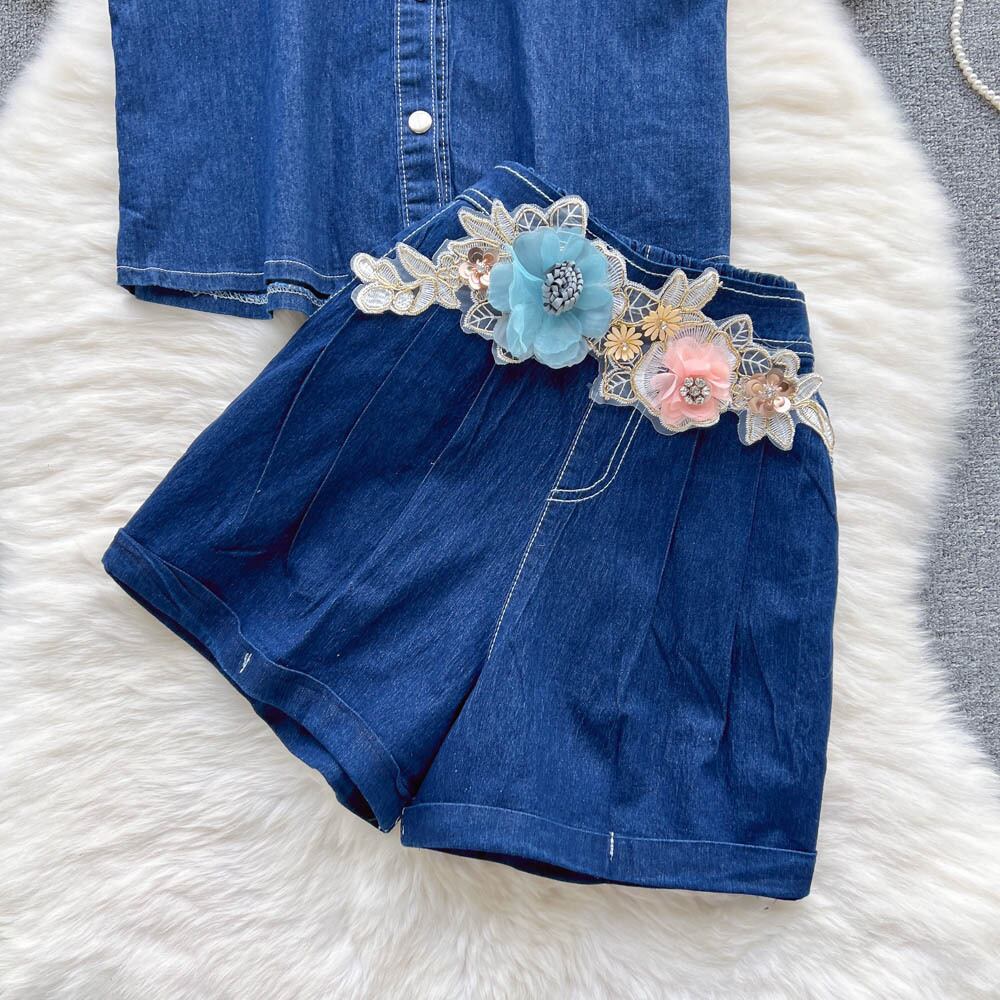 フレンチスタイルのボウデニムレディースセット2022年夏シングルブレストラペルトップス+ショーツジーンズツーピースセット衣装 リボン サマー 夏物 ブルマー Abe32587576461