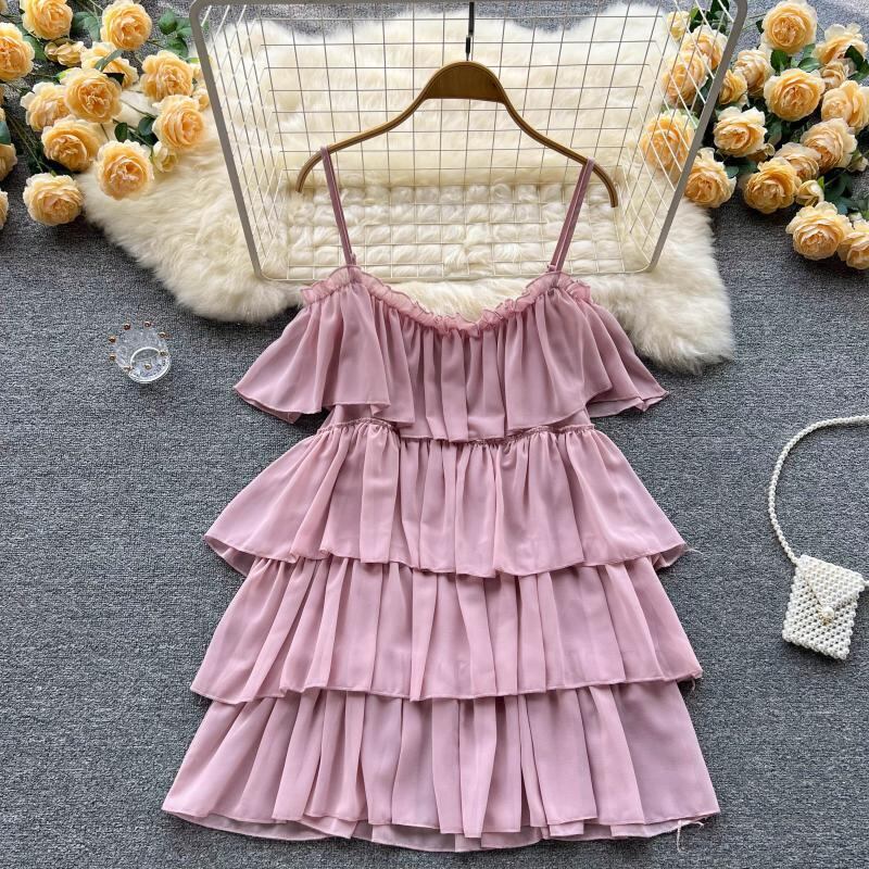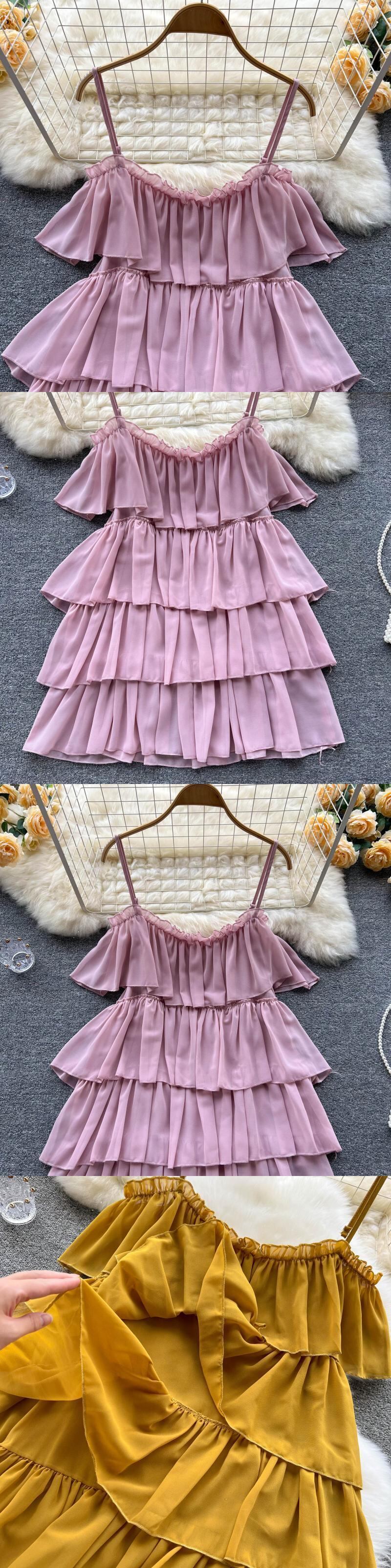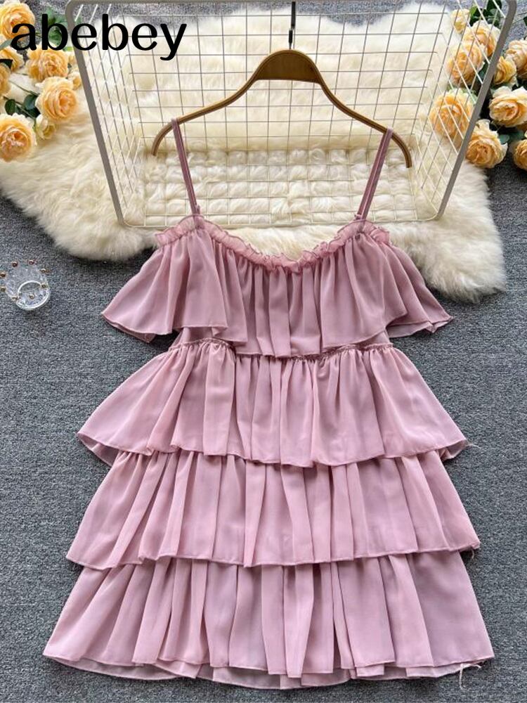 セクシーなスパゲッティストラップの女性のドレス夏のソリッドフリルオフショルダーサンドレスシフォンAラインビーチ自由奔放に生きるドレスVestidos ラッフル サマー 夏物 ソリッドカラー Abe49213131194