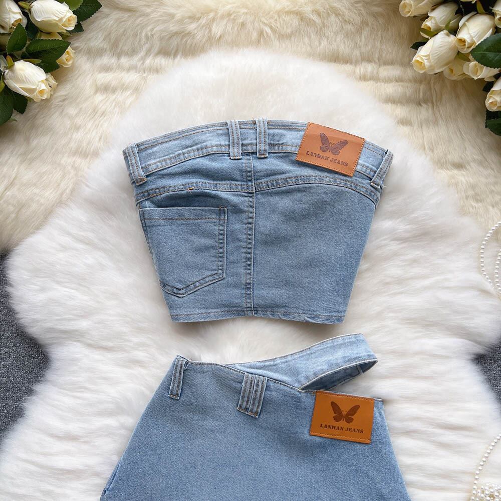 夏の女性2つの2ピースセットセクシーなストラップレスジーンズベスト+ウエストデニムスカートスタイルオフィスレディノースリーブスーツ衣装 サマー 夏物 会社 学校 通勤や通学にも Abe6769276659