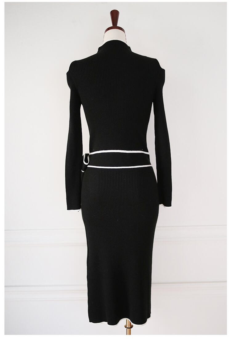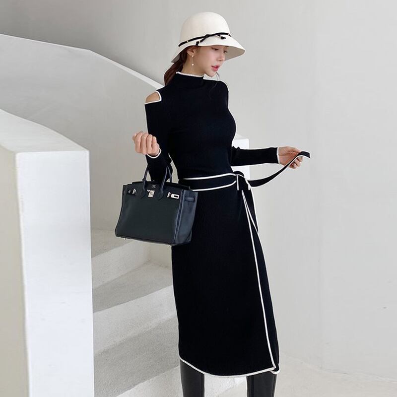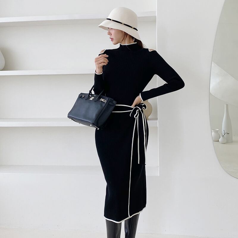 2020オータムスタイルカラー長袖小帯ドレススタイルスリムフィットミディアム丈ニットワンピース ロング 秋物 Rhc56438407369