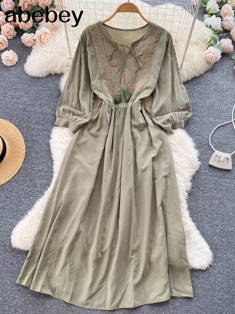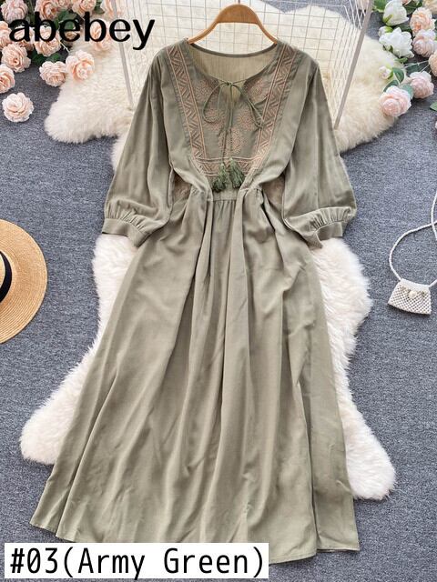 ボヘミアンレトロ刺繍ロングドレスoネックラフスリーブシースドレス2022エスニックタイウエストサマードレス 夏物 Abe53133960695