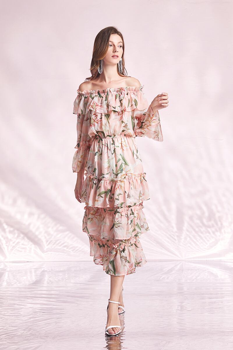 夏休みドレスレディースフローラルプリントティアードレイヤー裾メッシュフリルベルト付きミディホリデーパーティードレス レッド ラッフル サマー 夏物 ハーネス 花柄 Rhc45480233499