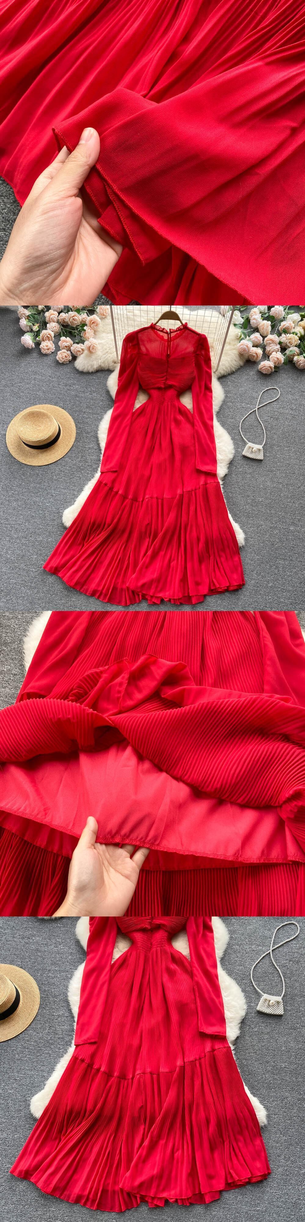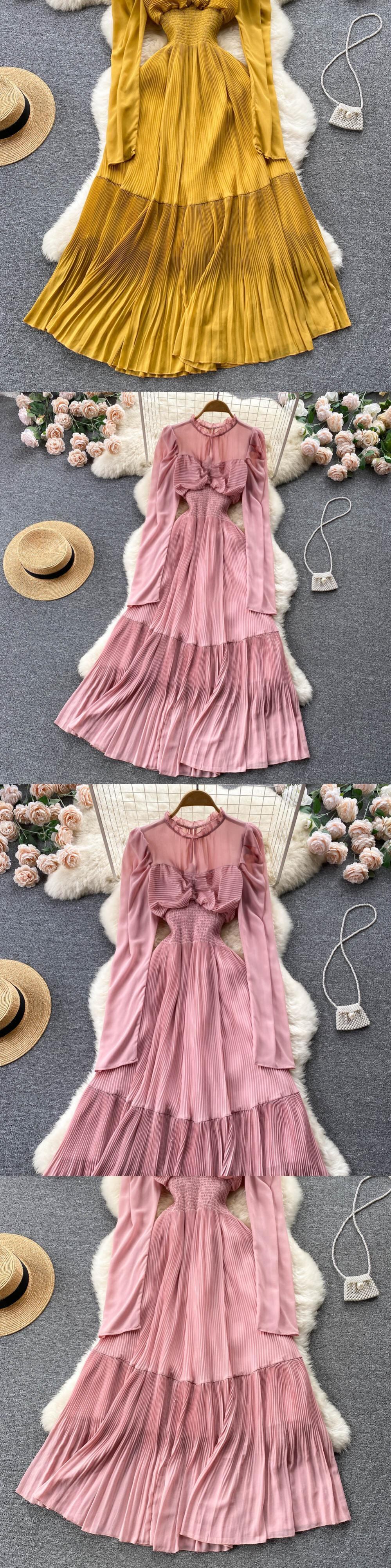 秋の女性用シフォンプリーツロングドレスフリルラウンドネックウエストAラインドレープパーティーマキシヴェスティドス2022 オータム 秋物 Oネック Abe91779442172
