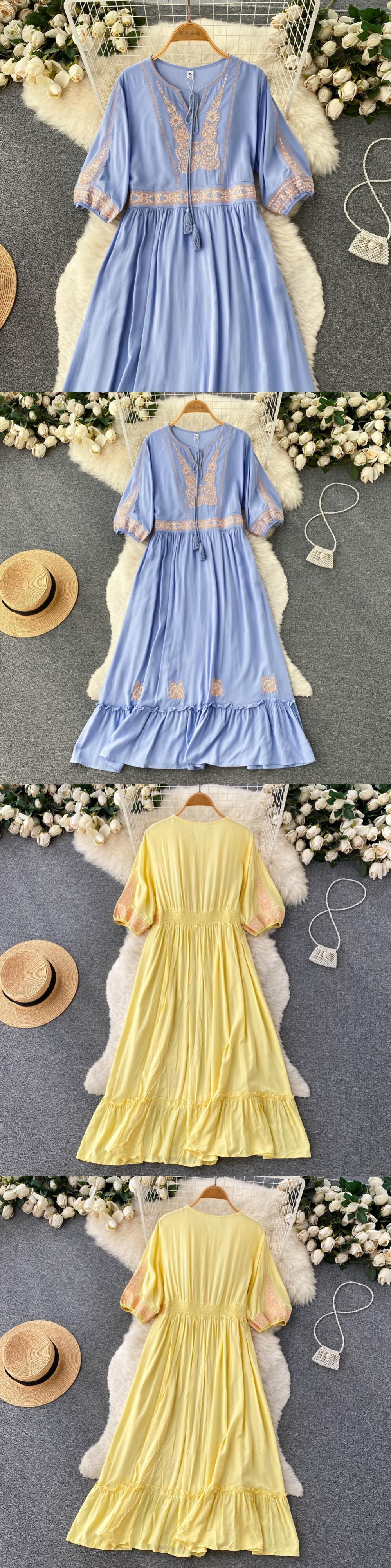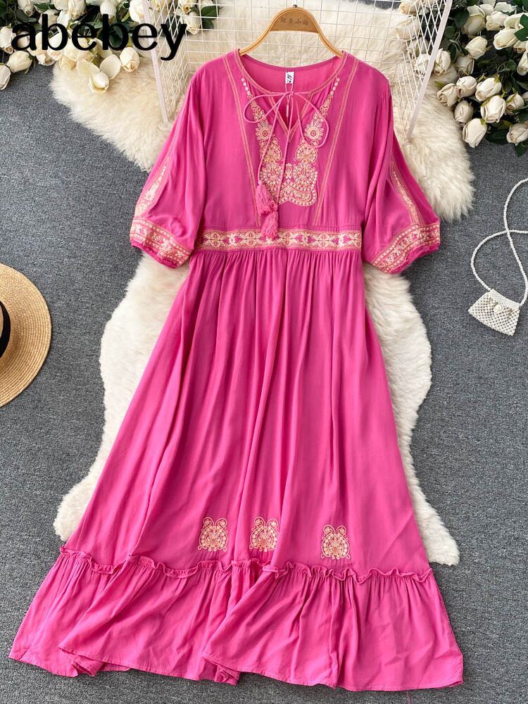 自由奔放に生きる花の刺繡半袖ルーズボヘミアンスタイルマキシヒッピーロングドレスフォークVestidos ショート ハーフスリーブ 刺繍 花柄 Abe21692240384