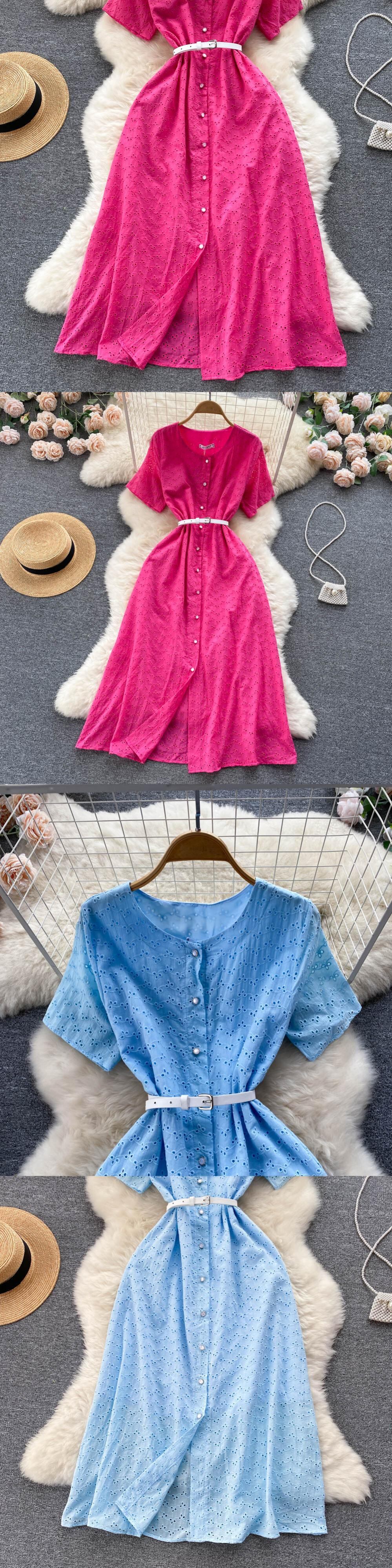 中空アウトレースロングドレス女性Oネックシングルブレスト半袖ウエストブルー/グリーンマキシローブサマー ショート ハーフスリーブ 夏物 Abe34546996052