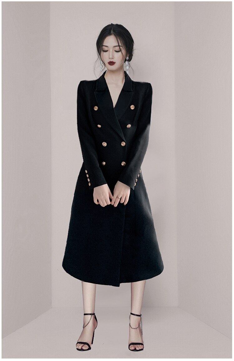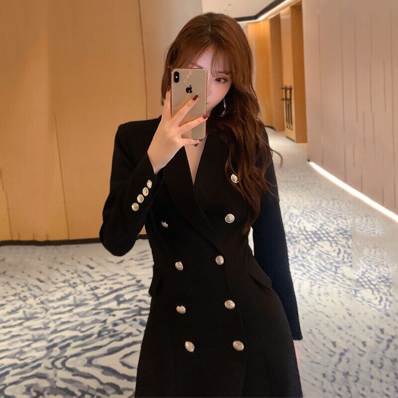 2020秋長袖ダブルパールボタンオフィスワークドレス薄手のドレス冬の黒のブレザードレス女性 ロング ブラック オータム 秋物 ウィンター 冬物 真珠 会社 学校 通勤や通学にも Rhc47899910065