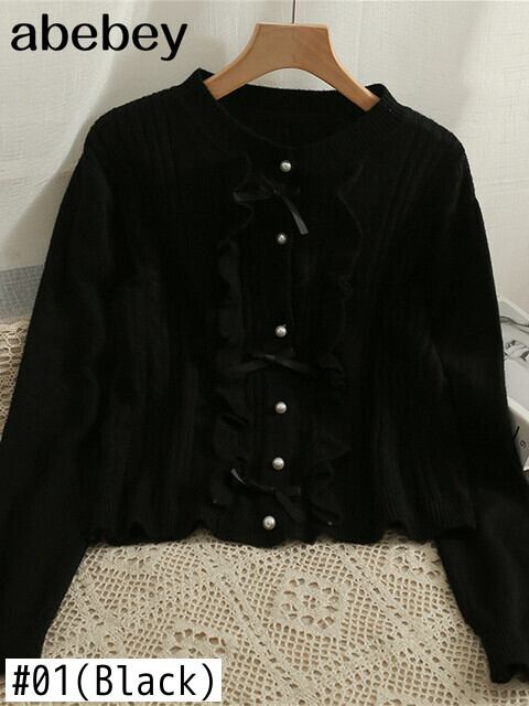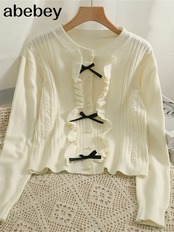 秋の女性のニットセーターOネック長袖カラーブロックカーディガンシングルブレストボウフリルフランスの女性のセーター ロング リボン ラッフル オータム 秋物 Abe41821480641