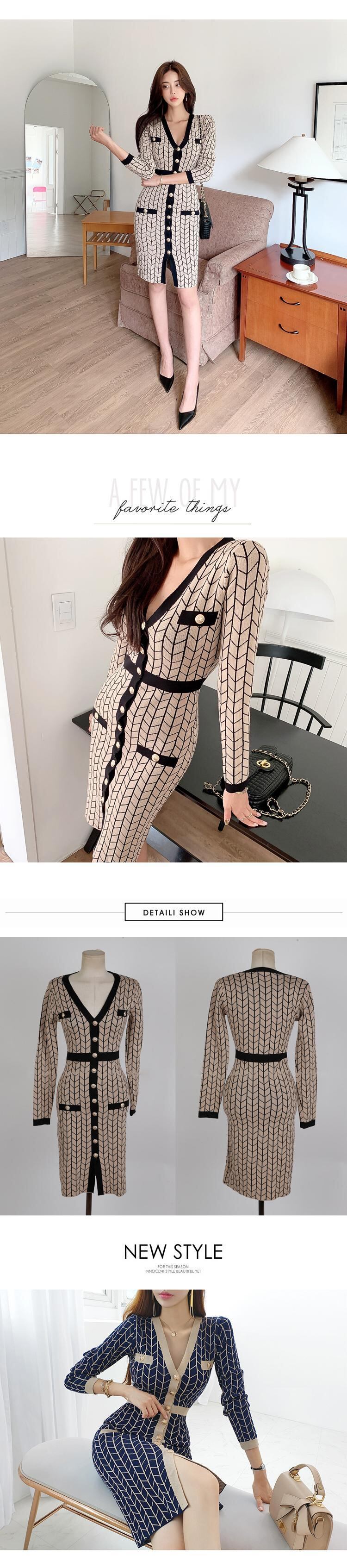 シックな秋のVネック長袖ニットドレスシングルブレストラティスニット弾性ドレス女性 ロング エラスティック 伸縮 オータム 秋物 Rhc85463906082