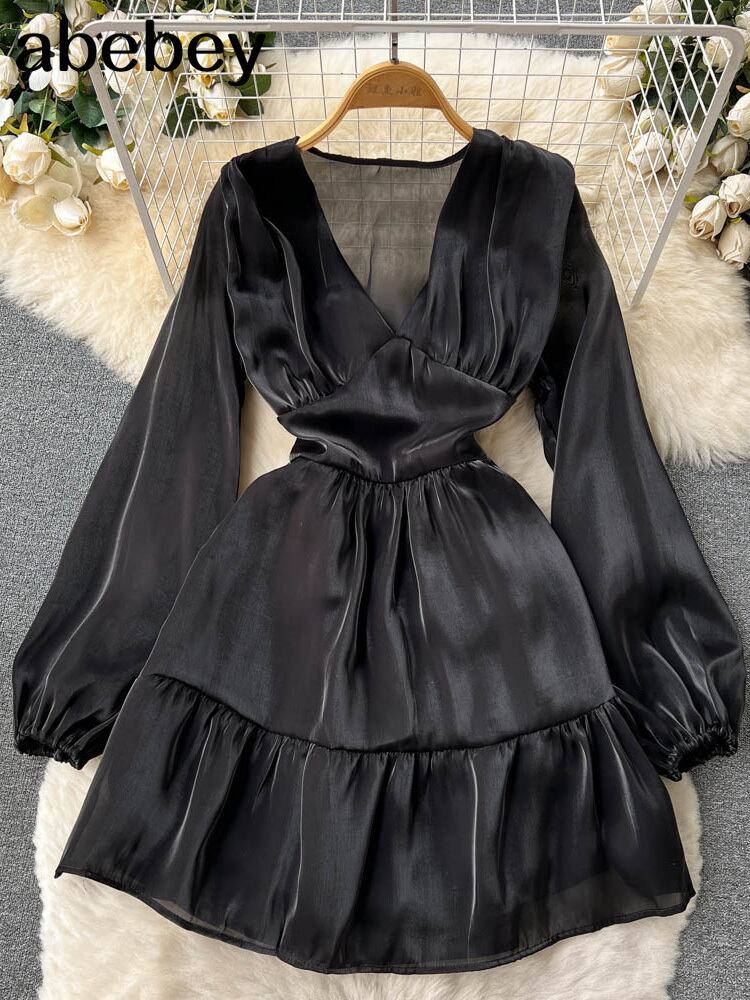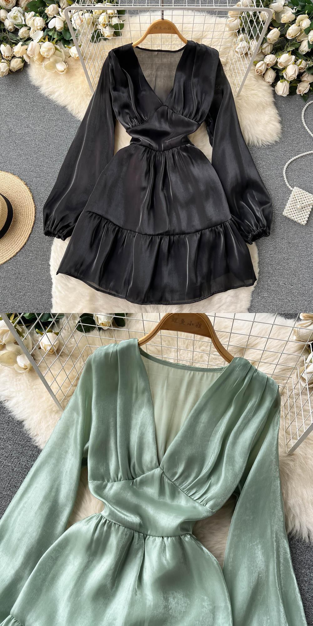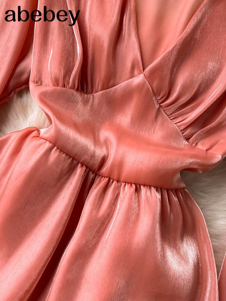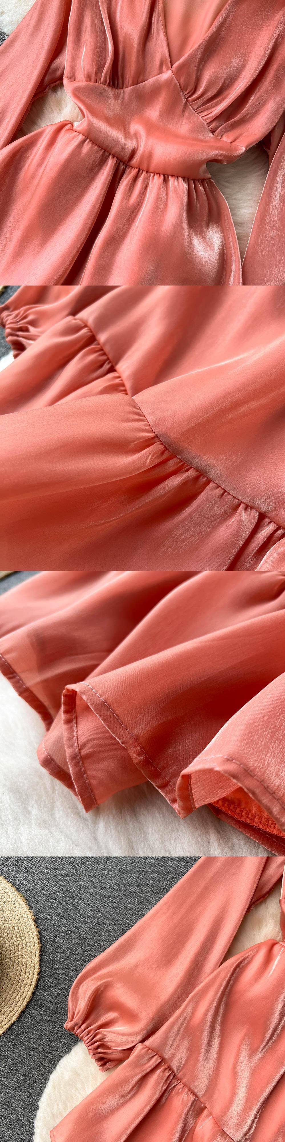グリーン/ピンク2022秋フレンチVネックロングランタンスリーブドレスフリルハイウエストレースアップサテンAラインミニショートドレス ハイウェスト ラッフル オータム 秋物 Abe82709640464