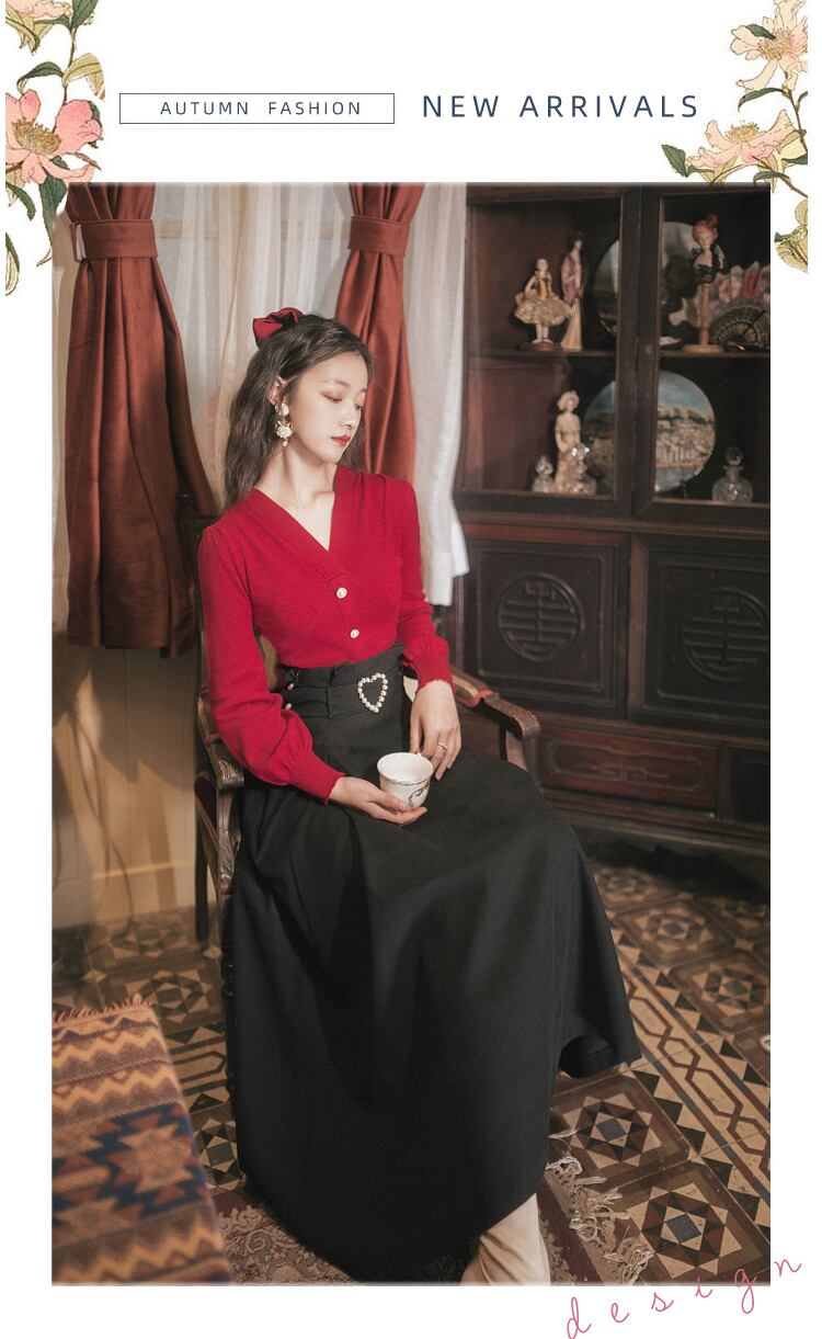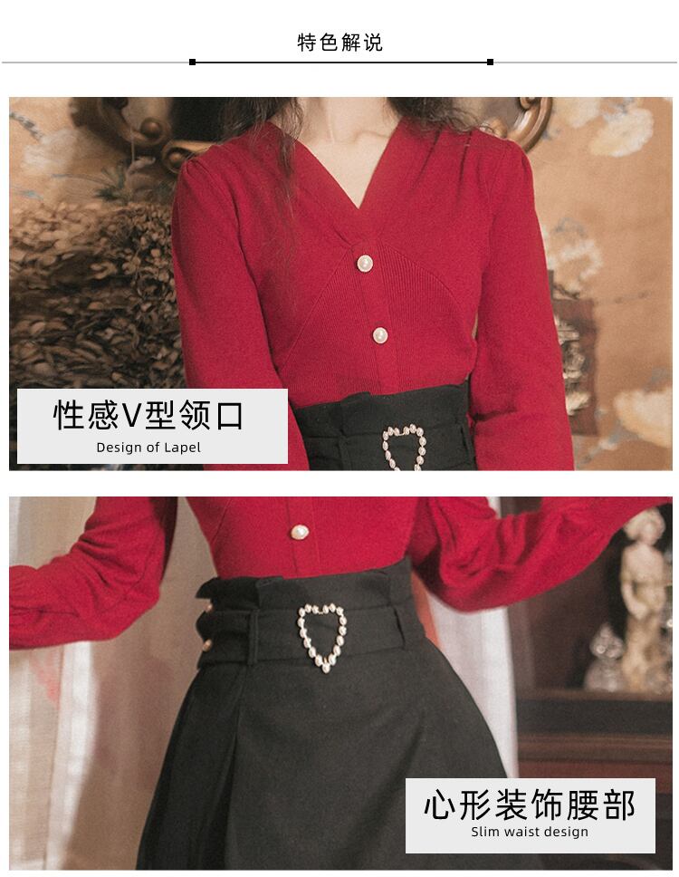2021年春の女性セットレースアップ2ピースセットVネック赤いセーター+ウエストビーディングスカートスーツ レッド スプリング 春物 Rhc30567870516