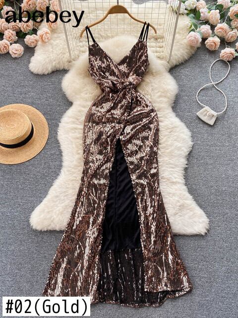 2022年夏のセクシーなパーティースパンコールドレス女性の背中の開いたマキシグリッターロングドレススパゲッティストラップVネックナイトクラブドレス サマー 夏物 Abe39350862481