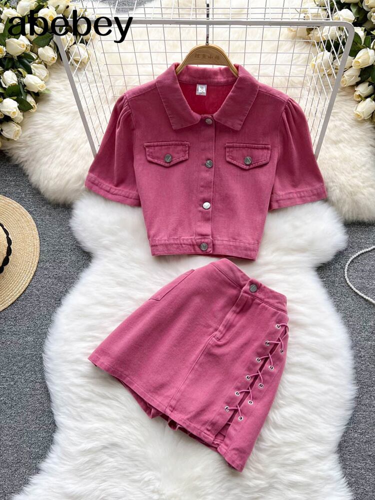レディースデニム2点セット2022年夏レトロピンクショートスリングデニムトップウエストスリムAラインスカートスーツ サマー 夏物 Abe87464463079