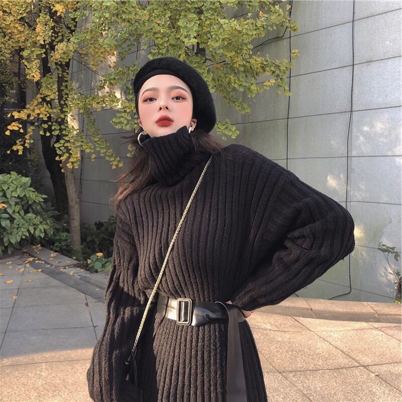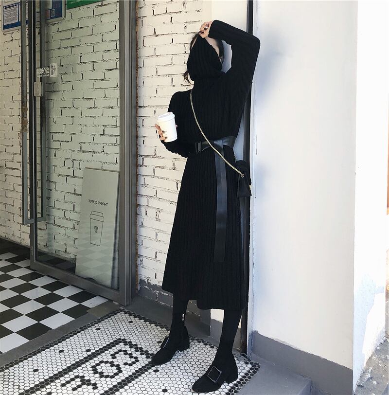 2021年秋のタートルネックミドル丈セータードレスワイルドな女性用オーバーコート、ベルト付きブラックスリムロングニットドレス オータム 秋物 ハーネス Rhc79325350334