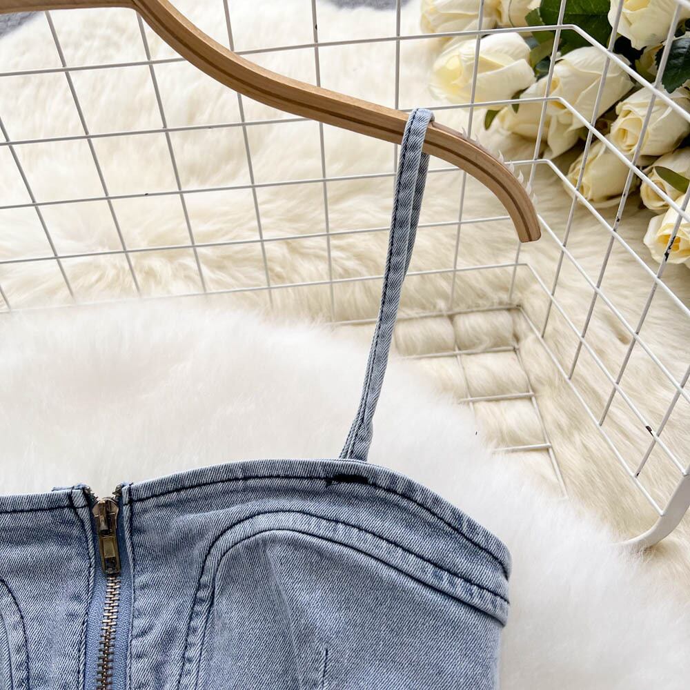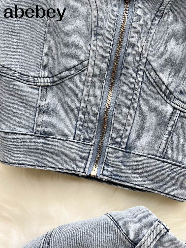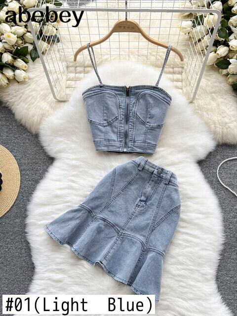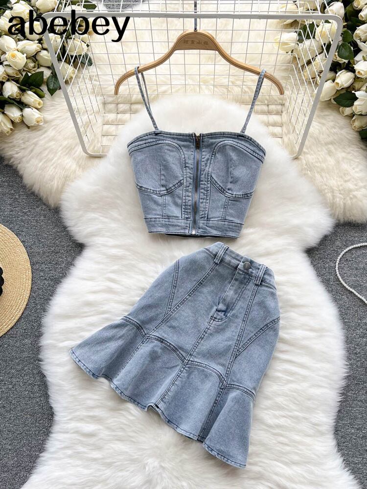 デニムセクシーな巾着女性セット2022年夏ジッパートップス+サッシュジッパースカートストリートツーピースセット衣装 サマー 夏物 Abe73283698156