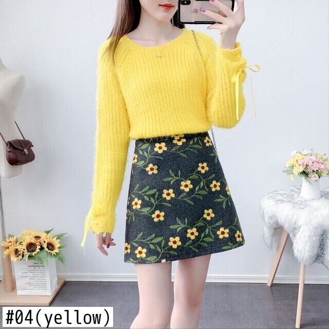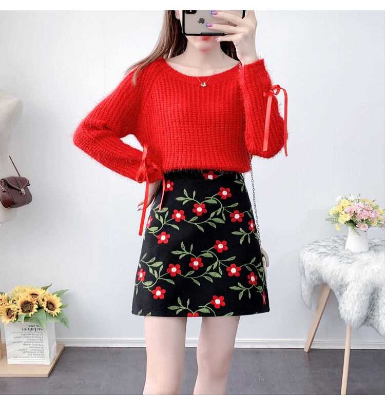2021年女性秋冬スリムウールスカートセットレディボウニットセーター+プリントミニスカートスーツ2点セット リボン オータム 秋物 ウィンター 冬物 Rhc90973037603
