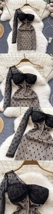 セクシーなワンショルダー長袖オフィスドレス女性ドットプリントボディコンドレスサマースキューカラーバックレスメッシュミニドレス ロング 夏物 会社 学校 通勤や通学にも Abe65605029624