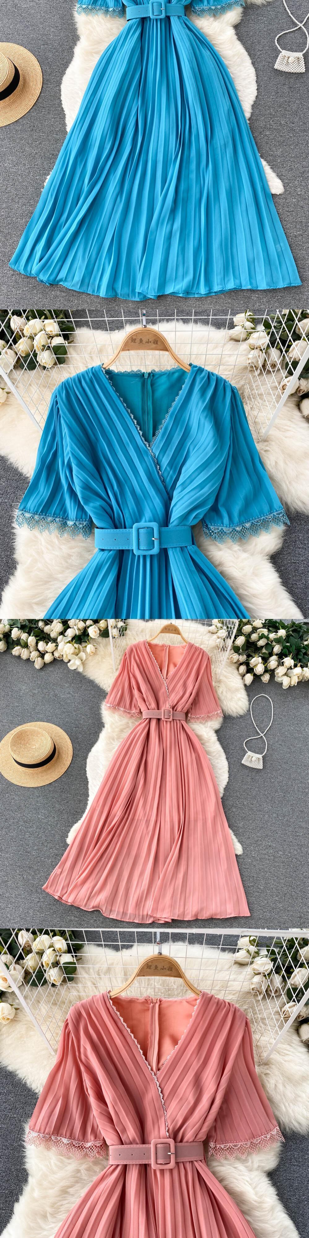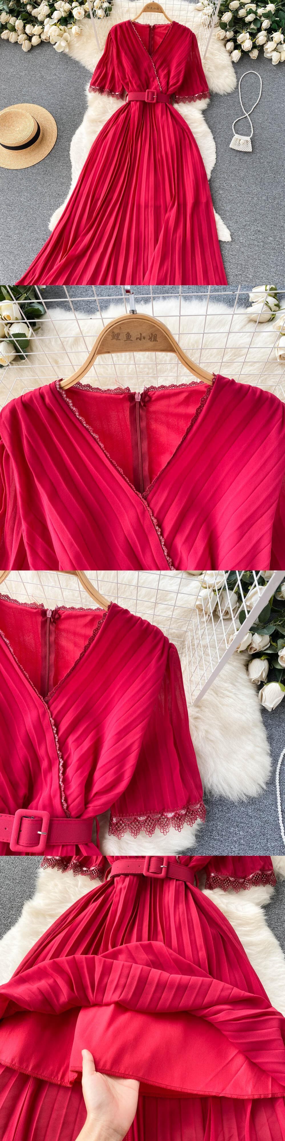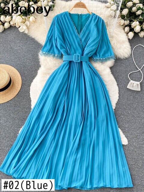 夏休みシフォンドレス女性2022プリーツロングドレス無地テンペラメントVネックマキシボヘミアドレスローブ サマー 夏物 ソリッドカラー Abe82357250952