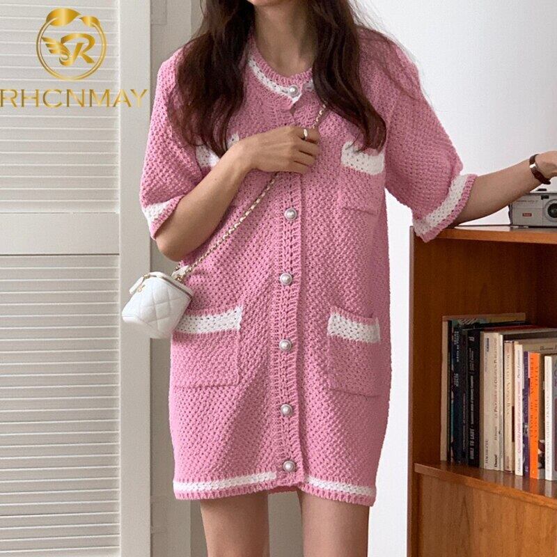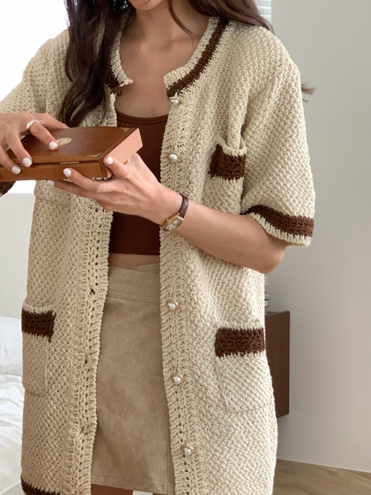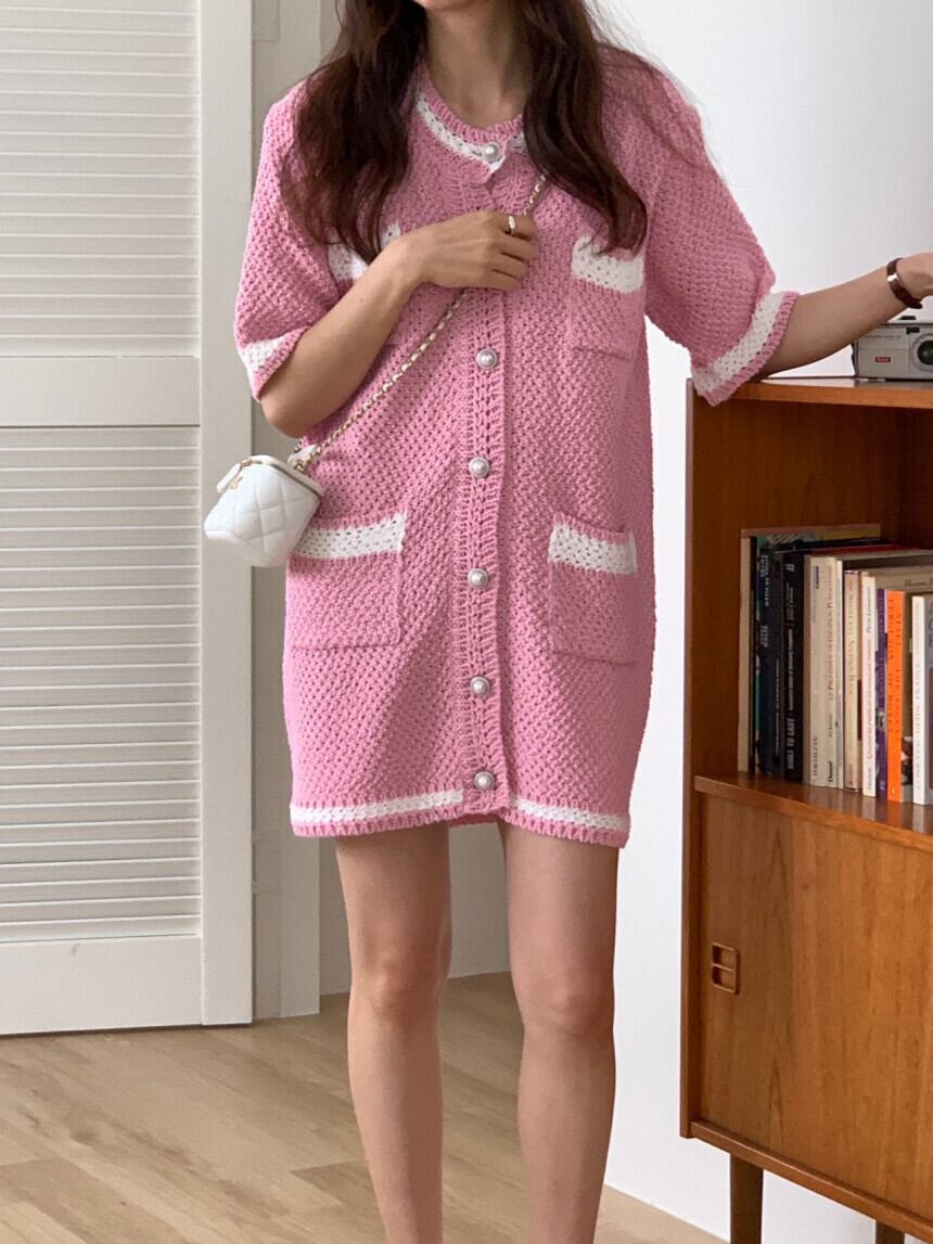 女性ショートストレートニットドレスサマーラウンドネックカラーブロックマルチポケットパールシングルブレスト半袖ニットジャケット ハーフスリーブ 夏物 Oネック 真珠 ポケット多め Rhc69816355130