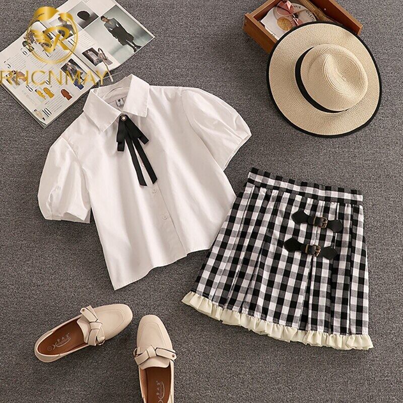 2021年夏のセクシーな女性セットパフスリーブ蝶ネクタイトップス+ウエストチェック柄ミニスカートガールズスタイルツーピースセット リボン サマー 夏物 Rhc65828814904