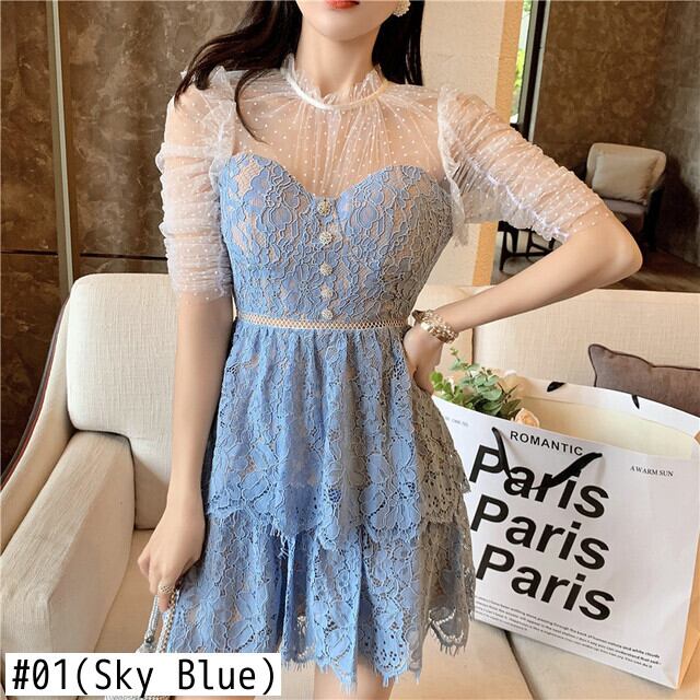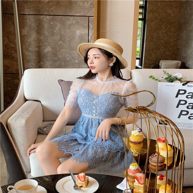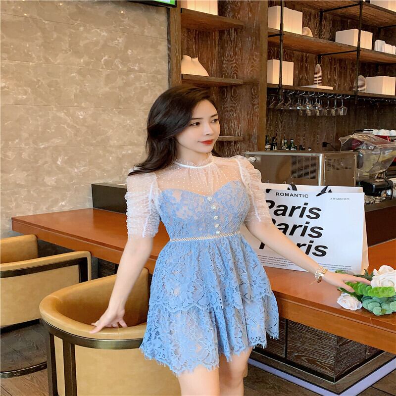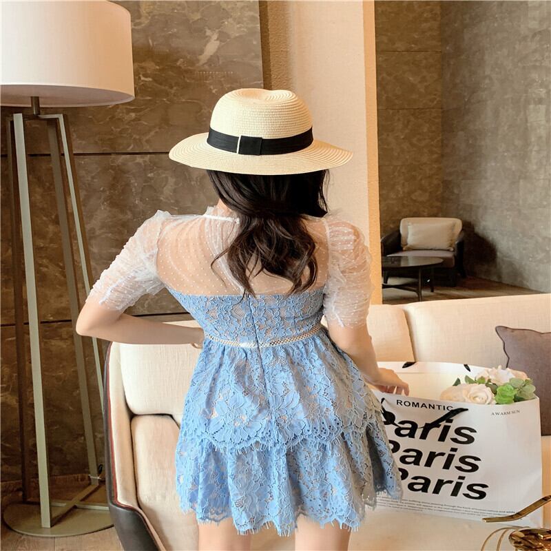 滑走路の女性の半袖ドレス2021夏シースルーホワイトメッシュスプライスブルーフリルレースドレスパーティードレス服 ショート ハーフスリーブ ラッフル サマー 夏物 Rhc41812019969